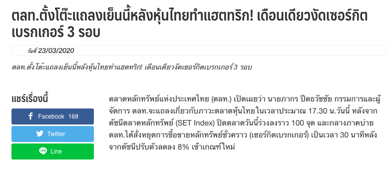 มาตรการทางการเงินแบบจัดเต็ม หยุดการลงของตลาดหุ้นได้ชะงัด ทำให้เรียนรู้ว่าครั้งต่อไปที่จะเอาเงินก้อนมาซื้อหุ้น ต้องรอจนเข้าสถานการณ์นี้ถึงจะปลอดภัย จากนี้ ตลาดหุ้นจะ"ไซด์เวย์เพื่อบัฟเฟอร์แรงกระแทก" อันเนื่องมาจากการขาดสภาพคล่องของตลาด อีกยาวนาน อาจจะถึง10ปี (ราคาหุ้นไม่ขึ้น ดัชนีเซทไม่ขึ้น)