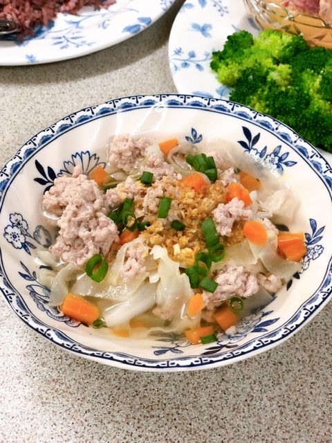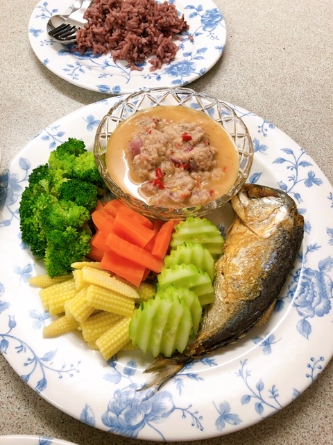 น้ำพริกปลาทู กินกับปลาทูทอด ผักรวมนึ่ง แล้วก็ แกงจืดหมูสับกะหล่ำปลีค่ะ