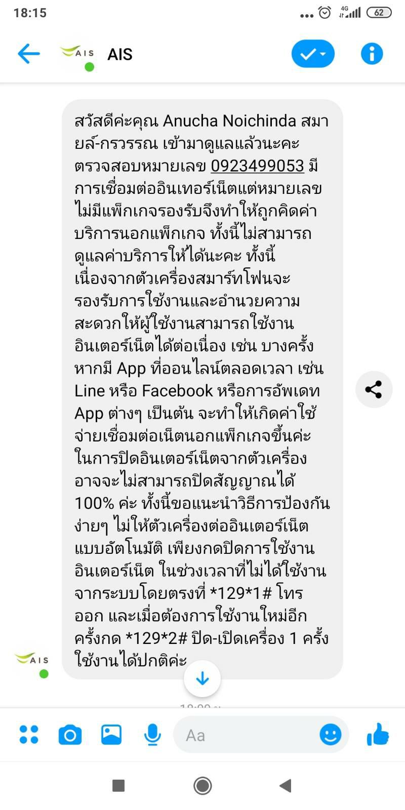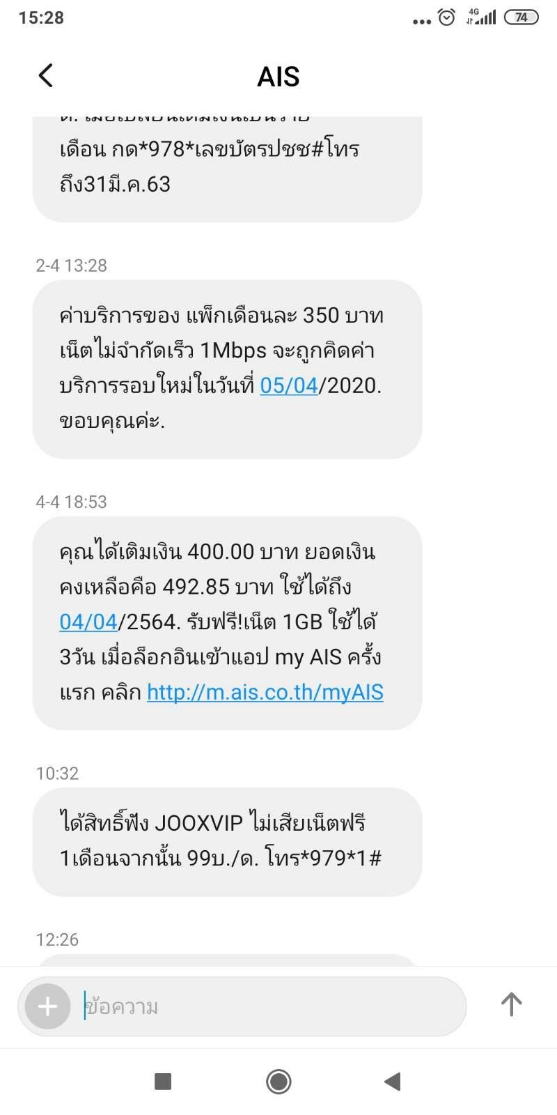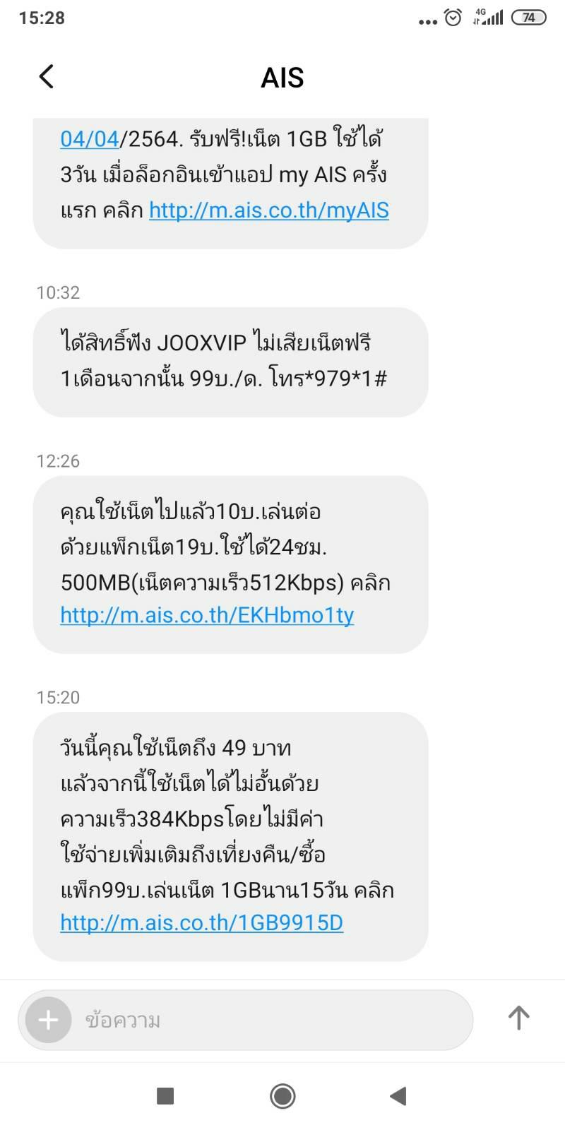 มีข้อความ Sms จาก Ais เสียเงินคือมาบ่อยมากวันเดียวเกือบ20ข้อความหัก 100 กว่าบาท จนยอดเงินติดลบ ไม่กล้าเติมเงินเลยตอนนี้ กด *137 ไปก็แล้วยังเหมือนเดิมเลยโทรไป 1175 พนักงานบอกว่าเป็น Sms ที่ส่งมาจ