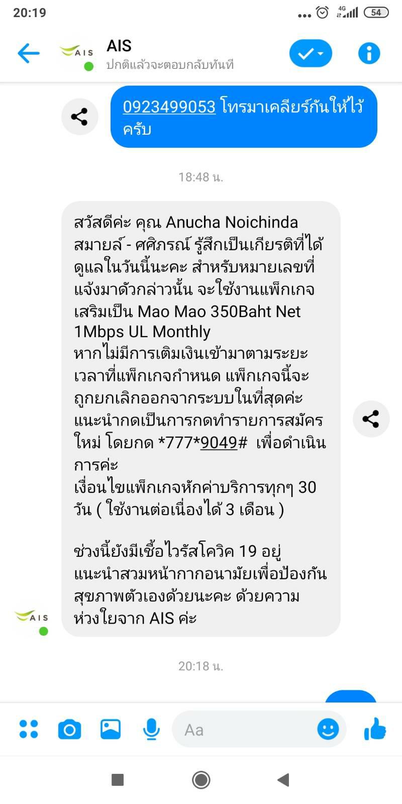 ต้องแจ้งให้ทราบก่อนว่าต้องมาพิมพ์ถามในนี้เพราะไม่สามารถหาช่องทางติดต่อพูดคุยกับคนได้ เดิมมีนัดกับพนักงานเอไอเอสวันพุธ ว่าจะคุยเรื่องโปรเน็ตรายปี แต่วันนี้จะทำงานโปรเน็ตเดิมที่ได้พรี 2 G แจ้งว่าเน็ตหม