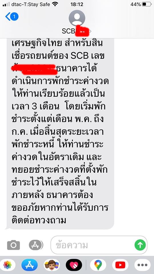 รบกวนสอบถาม SCB ค่ะ เกี่ยวกับการพักหนี้สินเชื่อรถยนต์