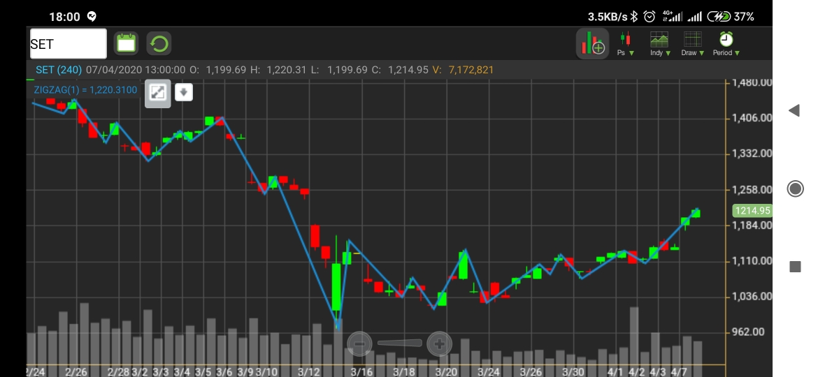 (บันทึก) 07/04/63 SET ปิดตลาด ที่ระดับ 1,214.95 จุด (+76 จุด)
