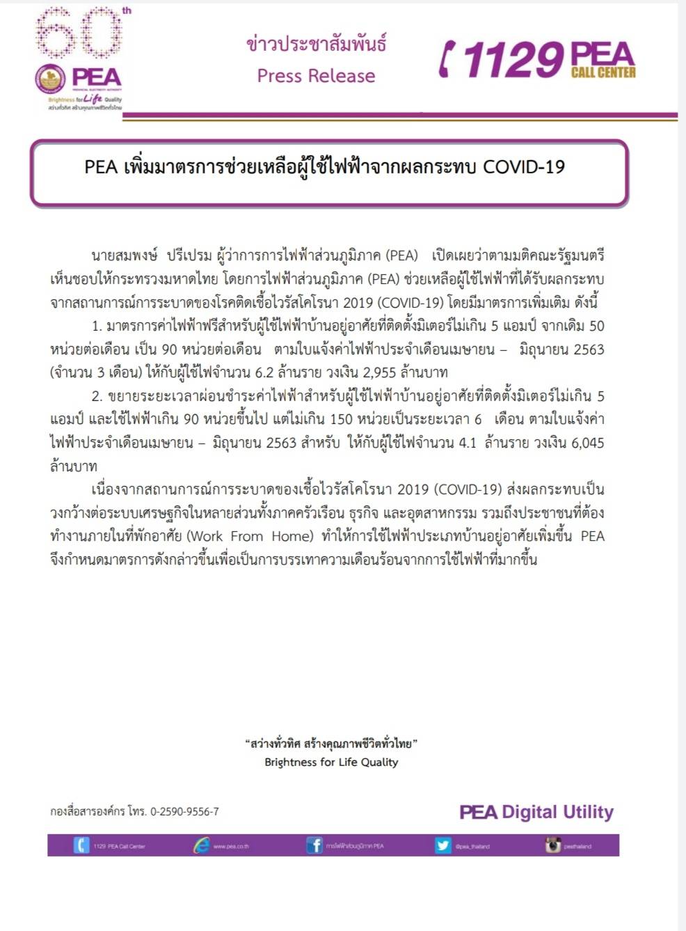 PEA เพิ่มมาตรการช่วยเหลือผู้ใช้ไฟฟ้าจากผลกระทบ COVID-19