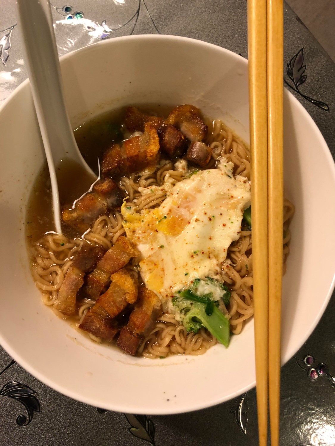ร้านอาหารปิดหมด คิดไม่ออกว่าจะทำอะไรเลยลองทำ "มาม่า" แต่มาม่าธรรมดาก็จะดูธรรมดาไป เลยลองเพิ่ม หมูกรอบ + ไข่ดาว + broccoli ค่ะ