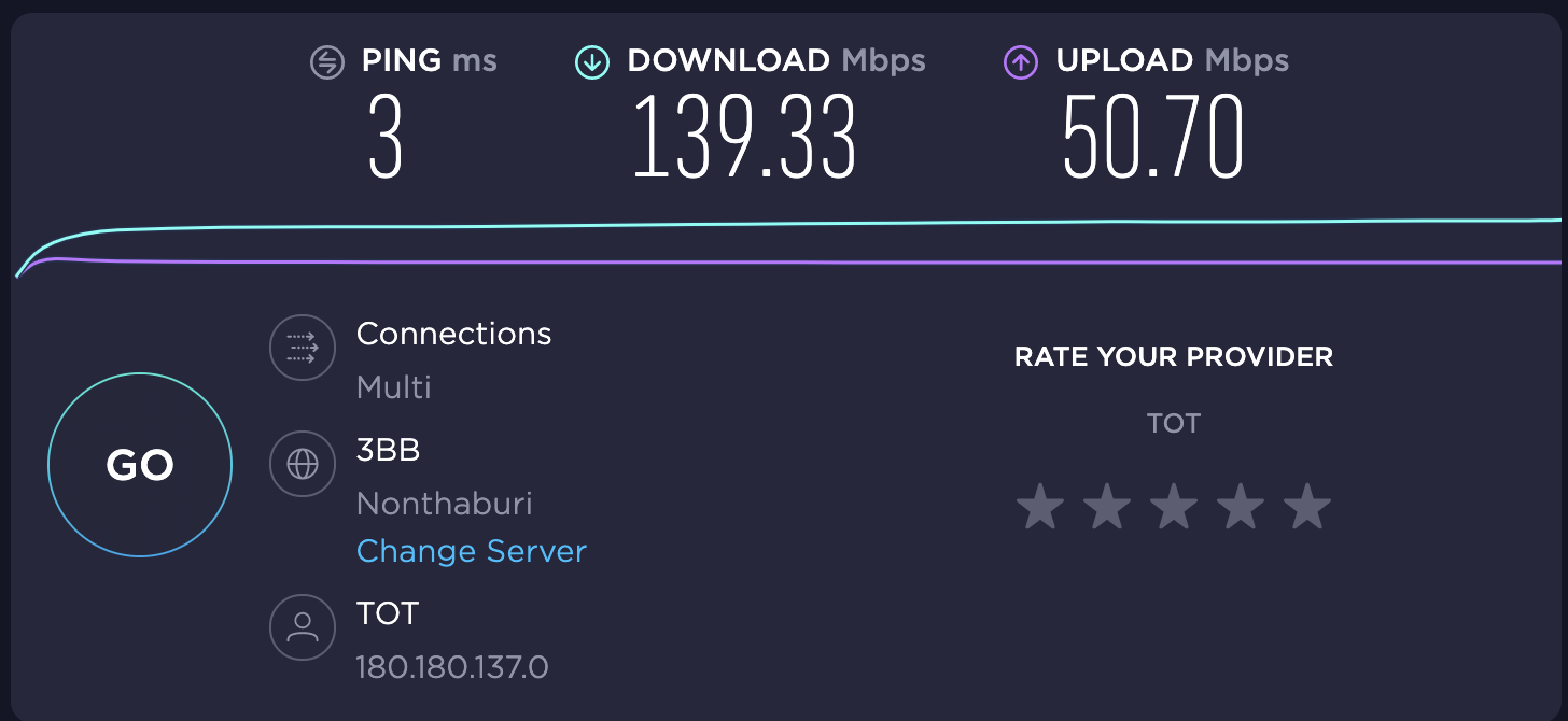 ซึ่ง internet แรงพอสมควร โดยถ้าผมเอา notebook ต่อเข้า Wifi หอของโดยตรงได้ความเร็วประมาณนี้
