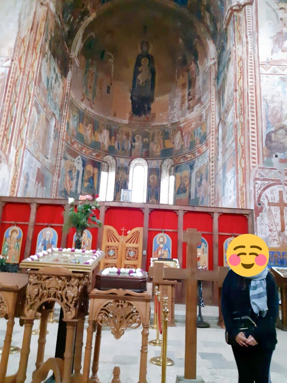 โปรแกรมเช้าของสันนี้ แวะชมอารามเกราติ (Gelati Church) ก่อนค่ะ สวยงามตามท้องเรื่อง จริงๆแล้ว อารามหรือโบสถ์แต่ละที่มีประวัติที่น่าสนใจมากนะคะ แต่ส่วนใหญ่แล้วจะไม่ให้ไกด์พูดเสียงดังค่ะ เพราะทุกที่ล้วนมีผู้คนมากราบไหว้ที่ต้องการความสงบตามแบบของเค้า ฉะนั้นหากใครต้องการทราบประวัติศาสตร์ หรือรายละเอียดในเชิงลึก รบกวนว่าอย่าคาดหวังในกระทู้นี้ค่ะ ฮะ ฮะ..สิ่งหนึ่งซึ่งถือว่าสำคัญมากในการเข้าชมอาราม หรือโบสถ์ในประเทศจอร์เจีย คือผู้หญิงควรมีผ้าโพกศีรษะ และเก็บผมให้เรียบร้อยก่อนเข้าชมภายใน เพื่อเป็นการให้เกียรติแก่สถานที่อันศักดิ์สิทธิ์ที่คนในท้องถิ่นให้ความเคารพ และศรัทธา ซึ่งถึงแม้จะไม่ใช่การบังคับเข้มงวดสำหรับนักท่องเที่ยวมากนัก แต่ด้วยจิตสำนึก และเพื่อรับผิดชอบต่อสังคม