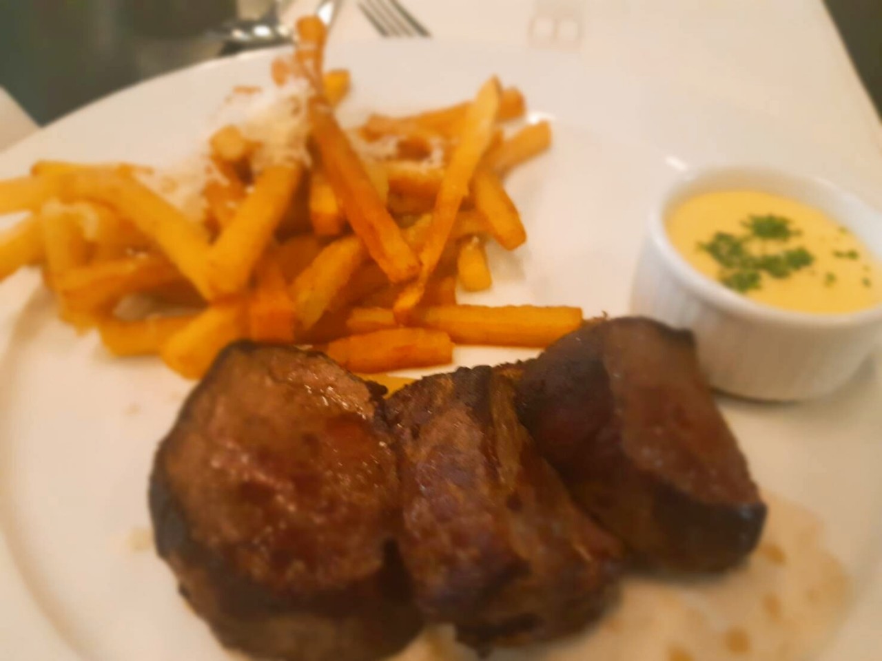 เมนูแนะนำในวันสุดท้าย จะดูเป็นยูโรเปี้ยนที่สุดตั้งแต่ทานมา เป็นสไตล์ยูโรเปี้ยนสเต๊กเฮ้าส์ ถูกปากมากค่ะ เพราะเป็นคนชอบทานสเต๊กเป็นชีวิตจิตใจ มื้อนี้จึงจัดสเต็กเนื้อไป สองจานเต็มๆค่ะ 55 ..อาหารอร่อยไม่พอ การตกแต่งอาหารของทางร้านก็ทำได้สวยประทับใจค่ะ..