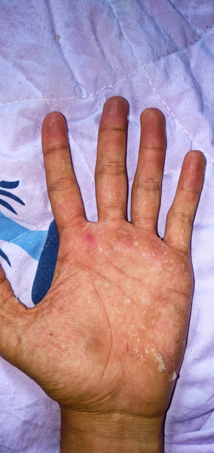 มีใครนิ้วลอกแล้วมีผื่นแดงตามฝ่ามือเหมือนกันมั้ยคะ