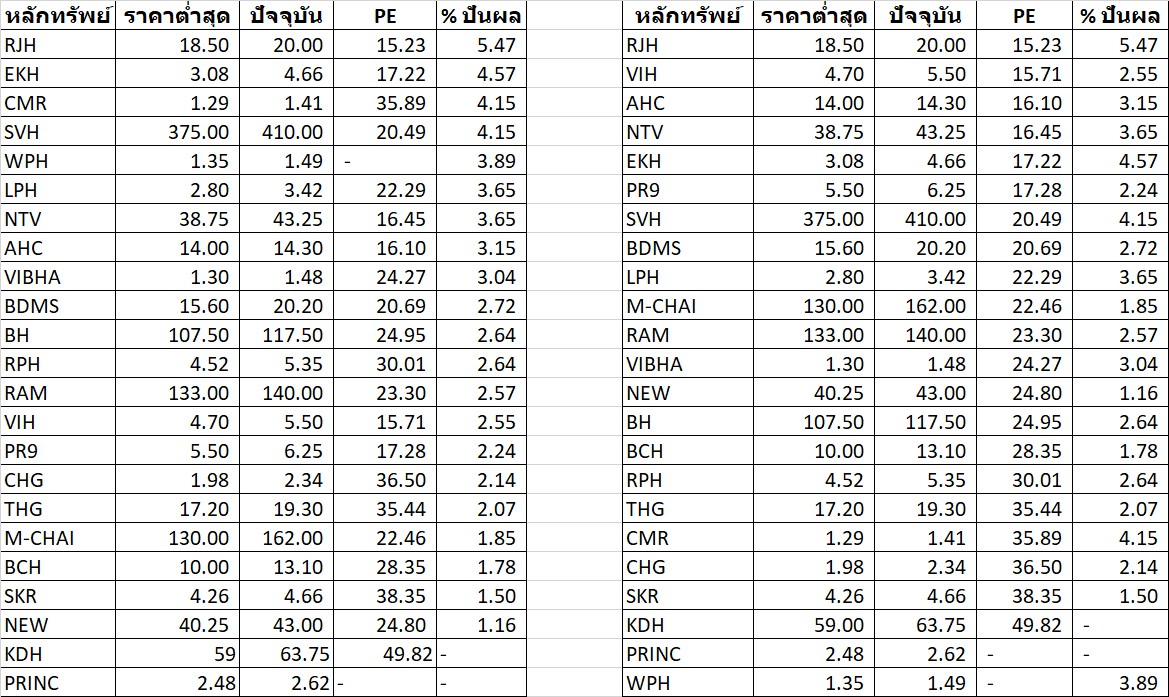 หุ้นกลุ่มโรงพยาบาล เรียงตาม ปันผล และ PE