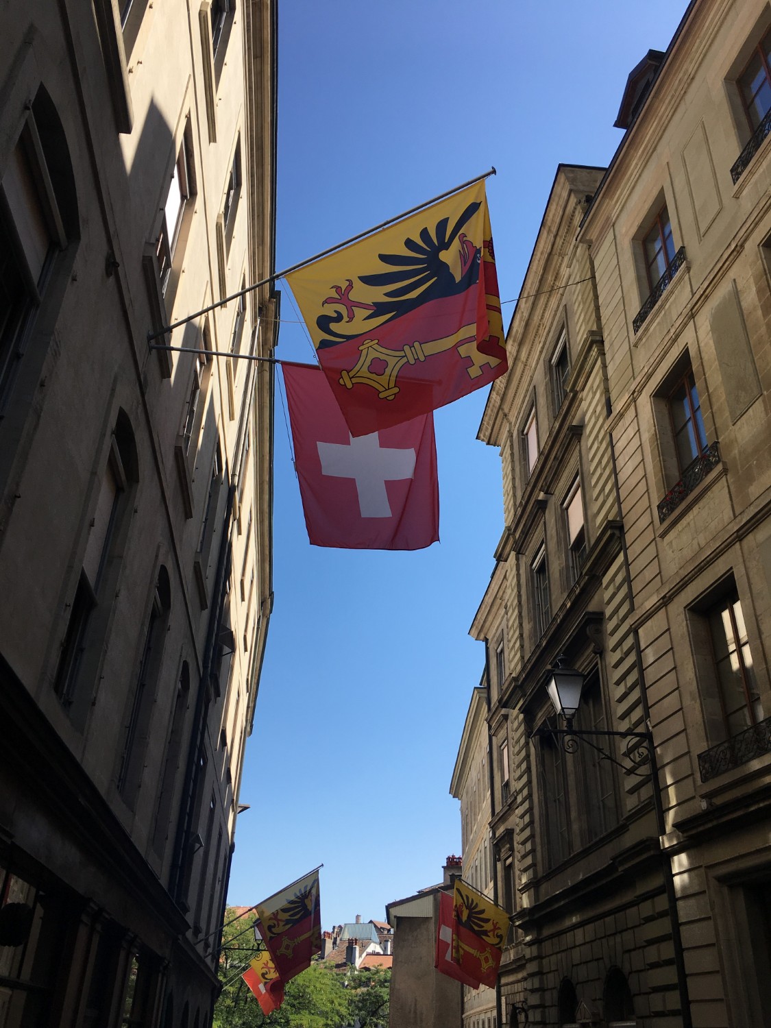 เดินในสวนสักพักก็ออกมาทางเดิมเดินขึ้นเนินนี้ก็จะเจอกับตรอกมากมายประดับด้วยธงของเจนีวา