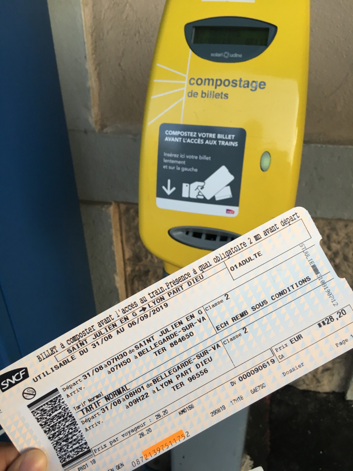 https://en.oui.sncf/en/ เมื่อได้ตั๋วเรียบร้อยแล้วก่อนขึ้นรถไฟจะต้องตอกบัตรที่ตู้สีเหลืองให้เรียบร้อย จากนั้นก็ขึ้นรถไฟได้เลย จะต้องไปเปลี่ยนขบวนที่ Bellegarde จากนั้นนั่งไปยัง Lyon