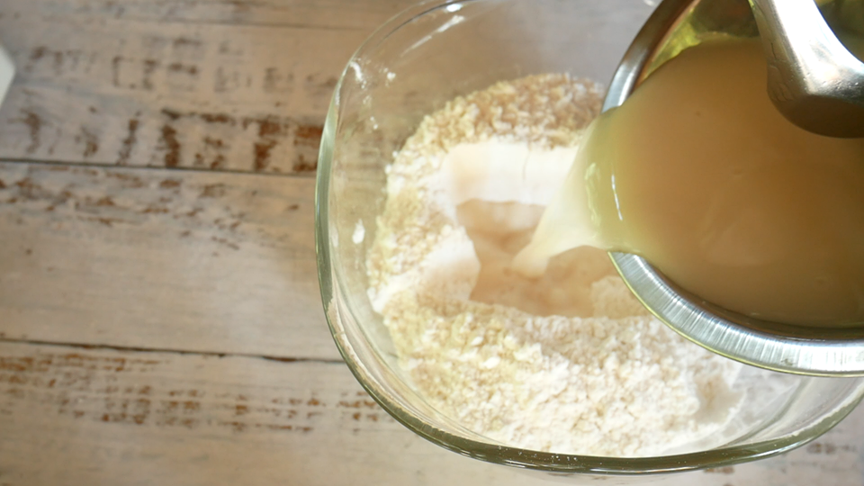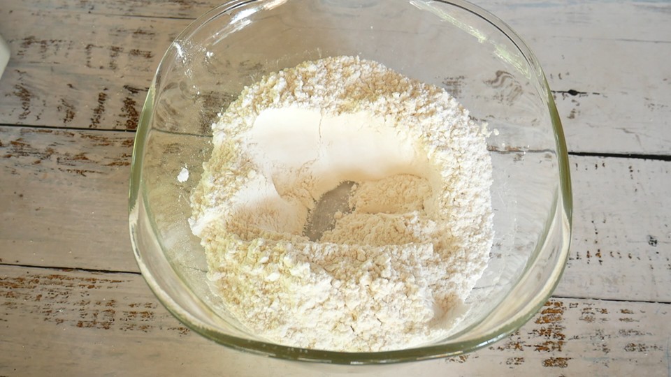 2. นำแป้งขนมปัง แป้งข้าวเจ้า เกลือ ผงฟู น้ำตาลทราย ใส่ลงชามผสมคนให้เข้ากัน แล้วทำหลุมตรงกลาง
