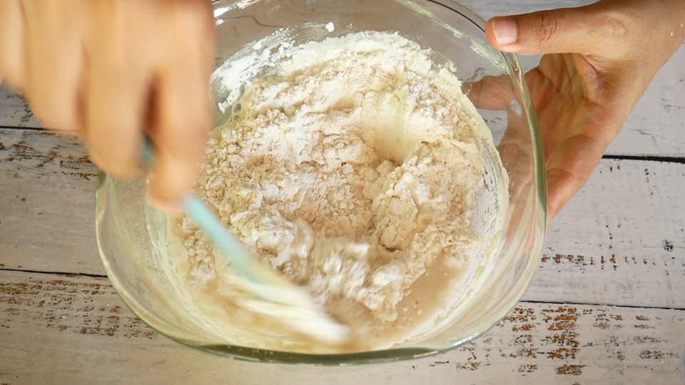 3. นำยีสต์ที่ผสมน้ำไว้ เทลงในหลุมแป้ง แล้วคนให้เข้ากัน