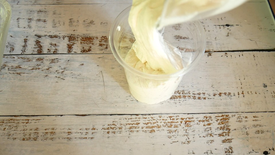 6. หลังจากครบเวลา ให้เทแป้งลงในแก้ว เพื่อให้ง่ายต่อการชุปฮอทดอก
