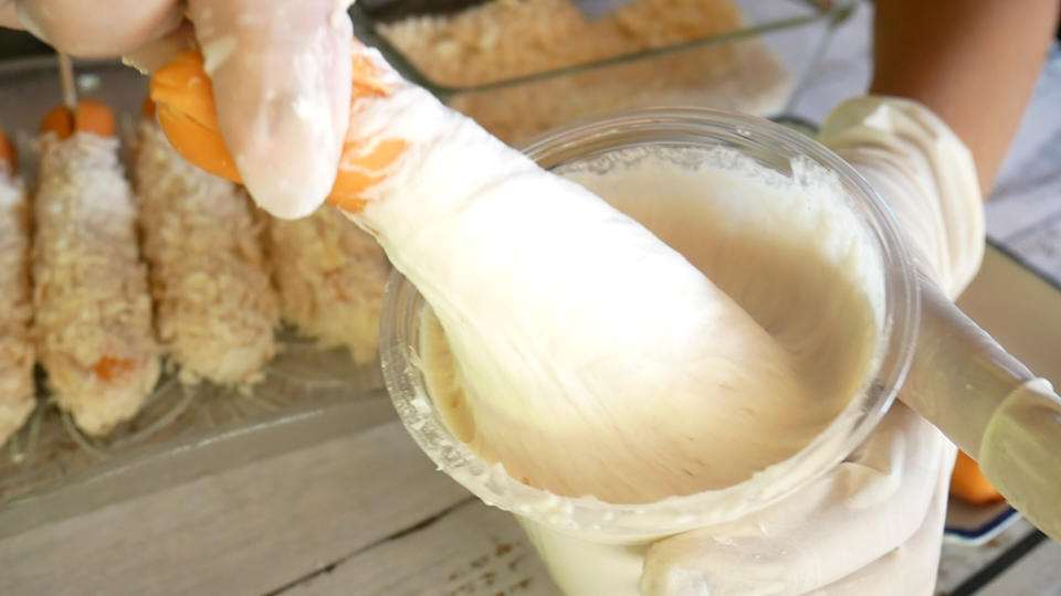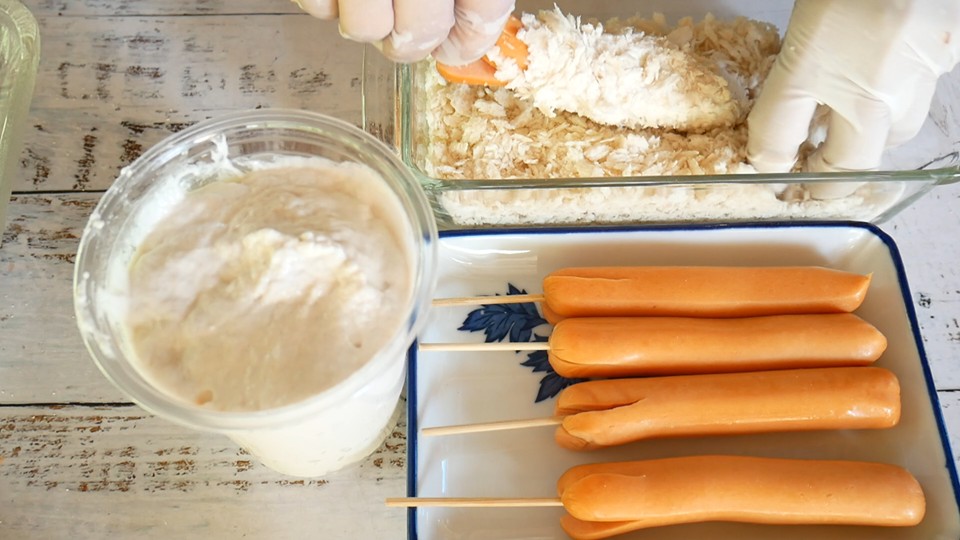 7. หลังจากนั้น นำฮอทดอกชุบลงในแป้ง แล้วก็ชุบเกร็ดขนมปัง ทำจนเสร็จ