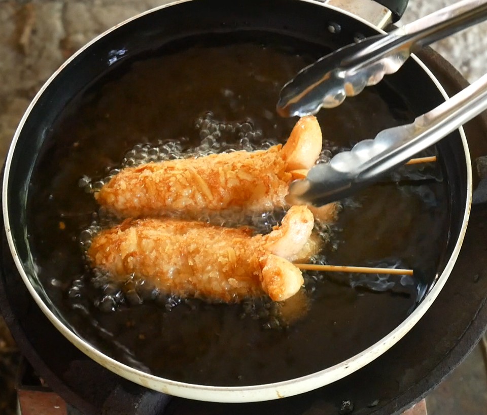 8. นำกะทะใส่น้ำมันปาล์มตั้งไฟปานกลาง เมื่อน้ำมันร้อนนำลงทอดจนเหลืองกรอบ