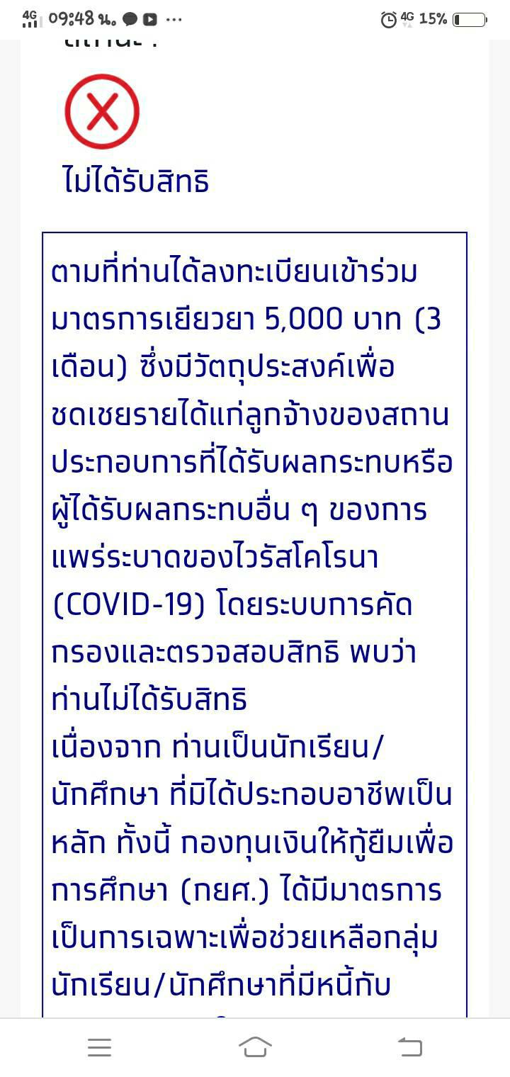 ผมเป็นนักเรียนทำงานเลี้ยงตัวเองมาตั้งแต่ป.5จนตอนนี้ปวช.3 เนื่องจากที่ทำงานเลี้ยงตัวเองเพราะพ่อแม่ได้เสียชีวิตไปตั้งแต่เด็กๆเลยดิ้นรนหาเลี้ยงให้ตัวเองได้เรียน จนมาถึงตอนนี้จนจบปวช.3กำลังจะต่อมหาลัย ด้วยค่าเทอมหมื่นสอง มันไม่เยอะหรอกครับผมคิดว่าผมสามารถหาได้ แต่ตอนนี้มันอยู่ในช่วงโรคCovid 19 ระบาด รายได้ที่เคยได้รับจะอยู่ที่280บาทต่อวัน แต่ตอนนี้ลดลงมาเหลือ 100 บาท แล้วตัวผมกู้กยศ.ด้วย คือพอมีเงินเยียวยา5000บาทเข้ามา เนื่องจากตอนนี้ผมเรียนจบปวช.ไปแล้ว ผมก็เลยทะเบียนรับเงินเยียวยา เผื่อจะได้มาเสียค่าเทอม แต่สุดท้ายผมก็ไม่ได้เงินเยียวยาโดยมันขึ้นว่าว่า
