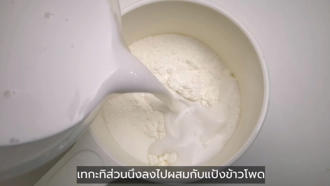 - นำกะทิส่วนนึงเทลงไปในแป้งข้าวโพดแล้วคนให้แป้งละลายจนเข้ากันดี จากนั้นพักไว้ก่อน