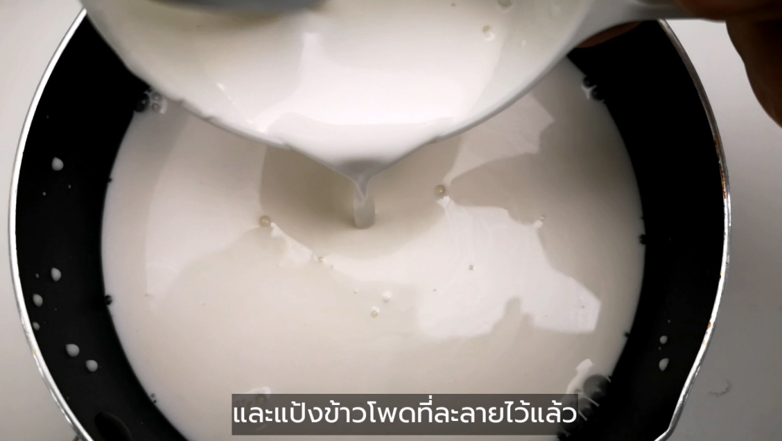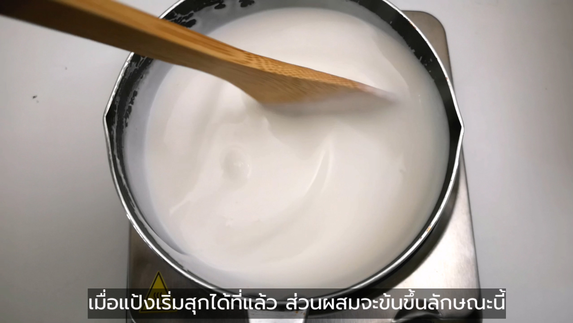 - ให้สักเกตว่าส่วนผสมจะข้นขึ้น แสดงว่าแป้งสุกแล้ว