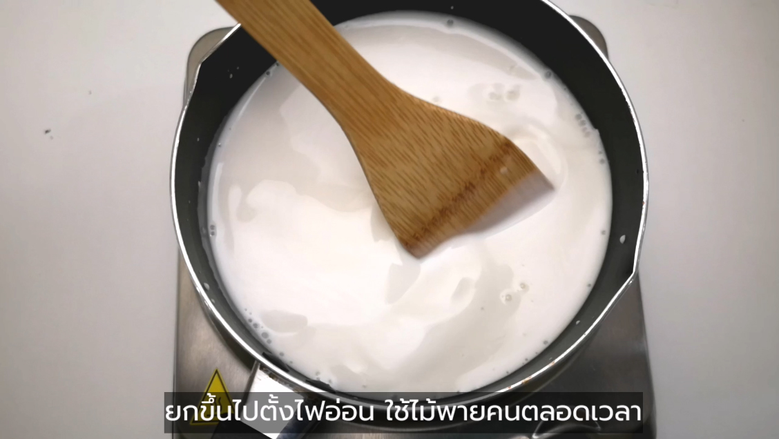 ต้องคนตลอดเวลาและห้ามใช้ไฟแรง เพราะอาจจะทำให้กะทิแตกมันได้ ใช้เวลาประมาณ 8-10 นาที