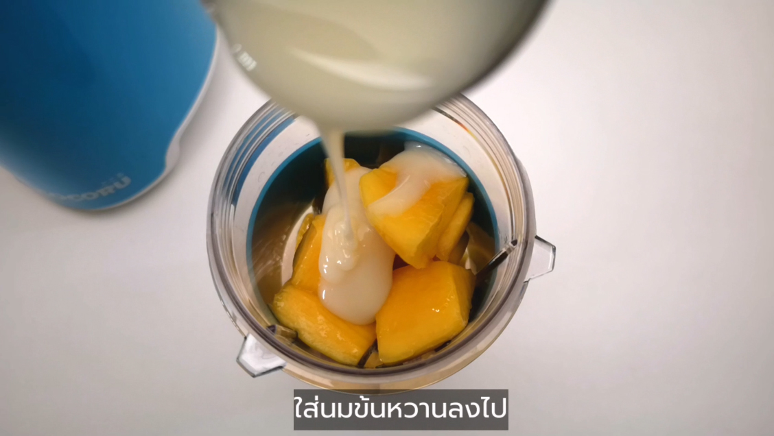 - นำมะม่วงกับนมข้นหวานไปปั่นรวมกัน