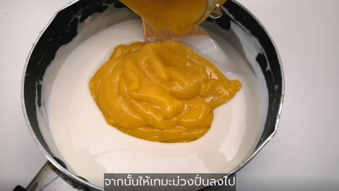 - หลังจากนั้นเอามะม่วงไปผสมรวมกับกะทิที่พักไว้จนเย็นสนิทแล้ว
