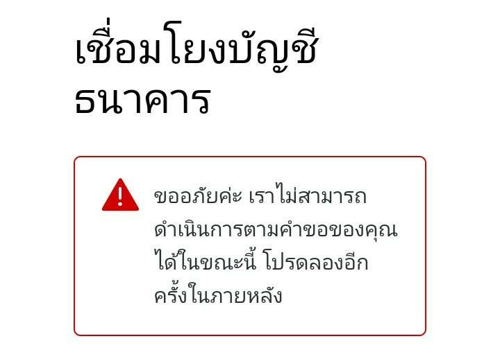 แล้วก็มีคำถามที่สอง ผูกบัญชีกับธนาคารไม่ได้ค่ะ กรอกรหัสแล้วขึ้นแบบนี้