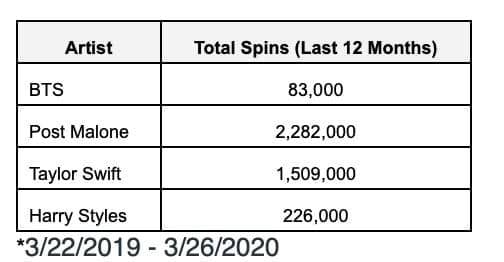 สถานีวิทยุที่ติดตามโดย MRC Data / Nielsen Music มีการเล่นเพลงของ BTS เพียง 83,000 ครั้งในปีที่ผ่านมา จากการเปรียบเทียบกับ Harry Styles ที่ได้รับสปินมากกว่าถึงสามเท่า, Toylor Swift เพิ่มขึ้นมา 18 เท่า, และ Post Malone อีก 27 เท่า