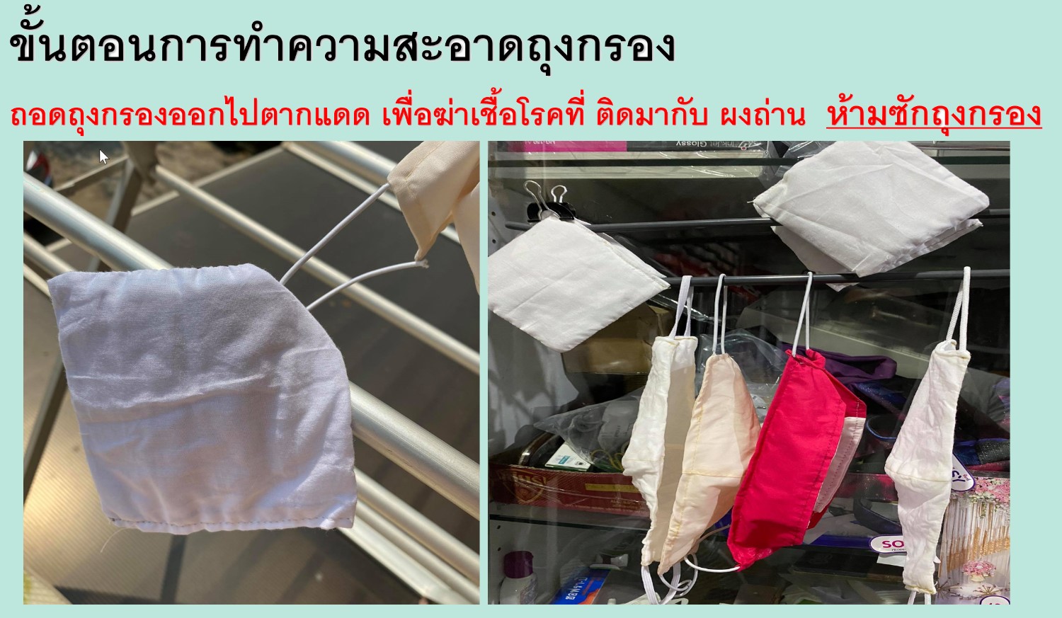 และวนใช้งานกันไป แม้ว่าหน้ากากผ้าทั่วไปจะไม่สามารถกัก กรอง ฆ่าหรือจับ ไวรัสได้ แต่ ยังดีที่ช่วยลดละอองฝอย จากการไอ หรือจามได้