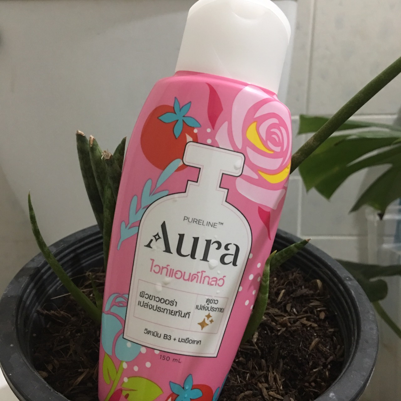4. โลชั่นบำรุงผิวกาย Aura ขวดสีชมพู สูตรไวท์แอนด์โกลว์