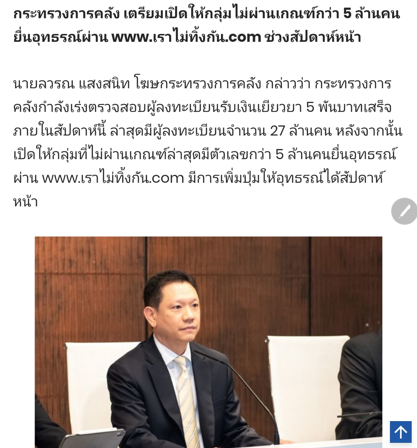 "คลังเปิดให้ทุกคนลงทะเบียนและยื่นอุทธรณ์ผ่านเว็บไซต์เท่านั้น หากให้มายื่นที่คลังใช้ระบบกระดาษคนมาจำนวนหลายล้านคน จะพิจารณาได้เร็วอย่างไร ระบบออนไลน์จึงเป็นระบบที่เร็วที่สุดในการช่วยเหลือผู้ได้รับความเดือดร้อน สำหรับผู้ลงทะเบียนที่ต้องการปรึกษากับเจ้าหน้าที่โดยตรง แต่ไม่สามารถติดต่อผ่านคอลเซ็นเตอร์ได้ ระบบสามารถให้ส่งคำถามผ่านเว็บไซต์" นายประสงค์ กล่าว