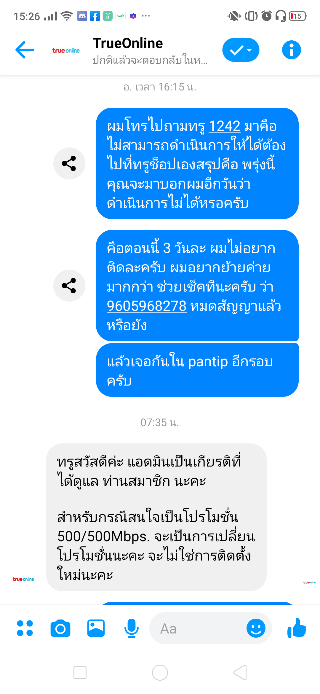 จะอัพสปีดเน็ตแต่คุยวกไปวนมา ถามย้ำวันละครั้งไม่ดำเนินการให้ถามนิดนึงอีกวันนึงก็มาถามใหม่ทั้งๆ ที่ตอบดักทางไว้แล้วยังมาถามใหม่เหนื่อยกับการรอ คือถ้าติดไม่ได้ก็ขอยกเลิกเลยครับ เสียเวลาชีวิตจริงๆ เมื่อวานว่าจะมาโพสพันทิปแต่ก็คิดว่ารออีกวันลกัน แล้วคือมาบอกแค่เนี้ย บอกเพื่ออะไรคือเปลี่ยนโปรโมชั่นไม่ใช่ติดตั้งใหม่ ใครๆก็รู้ปะครับ
