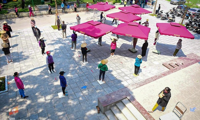 อย่างในรูปสถานที่ราชการทุกแห่ง ธนาคาร รวมถึงร้านสะดวกซื้อเอกชน แม้กระทั่งร้านขายอาหารอย่างเฝอ จะต้องทำสัญลักษณ์บนพื้นระยะห่าง 2 เมตรครึ่ง บริเวณด้านหน้าของสถานที่นั้น