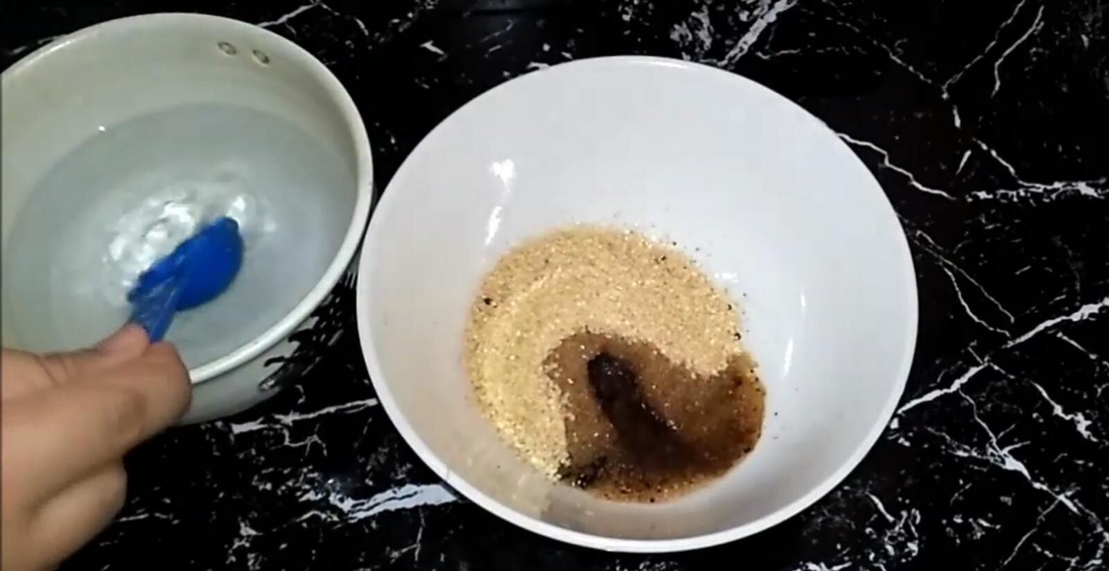 เริ่มจากทำครีมกาแฟเกาหลีกันก่อนค่ะ ใช้กาแฟสำเร็จรูปไม่ผสมครีมเทียม 3 ชต. น้ำตาลทราย 3 ชต. และน้ำร้อน 3 ชต. ตีผสมด้วยตะกร้อมือให้ส่วนผสมเข้ากัน