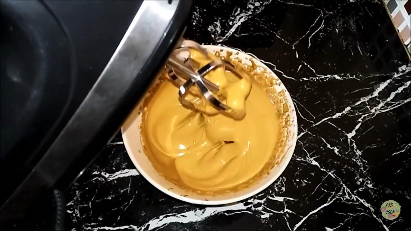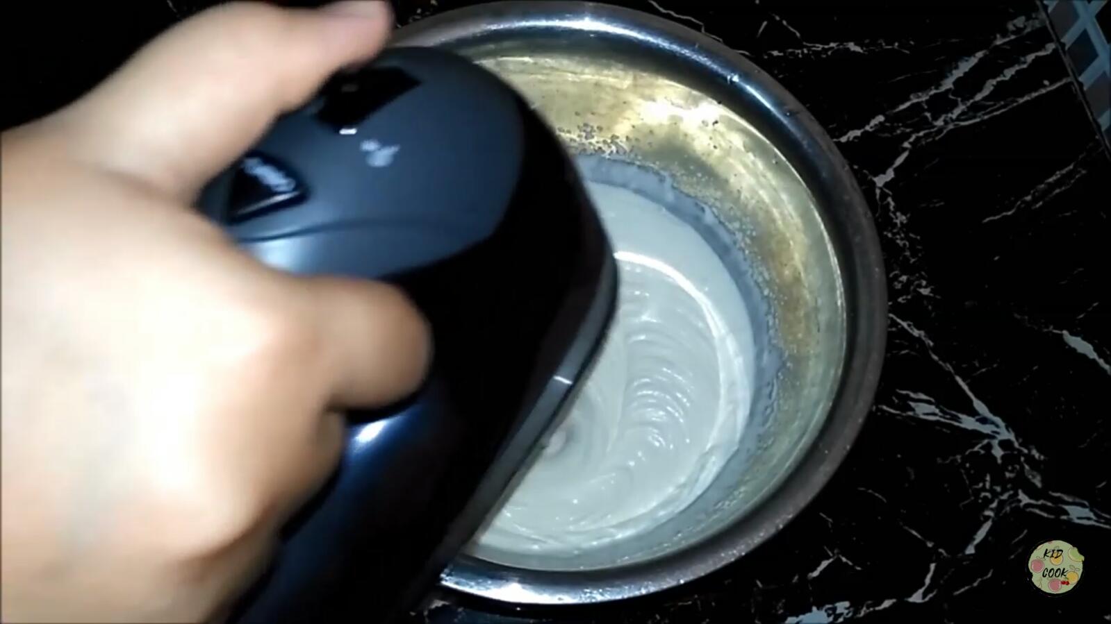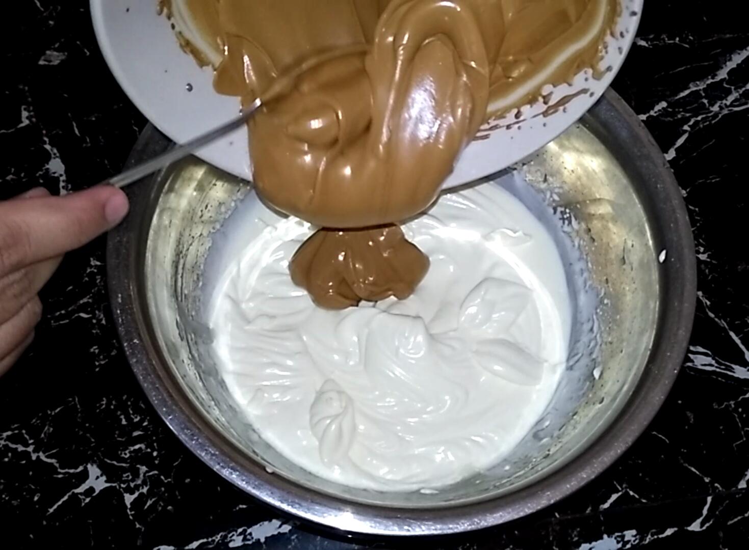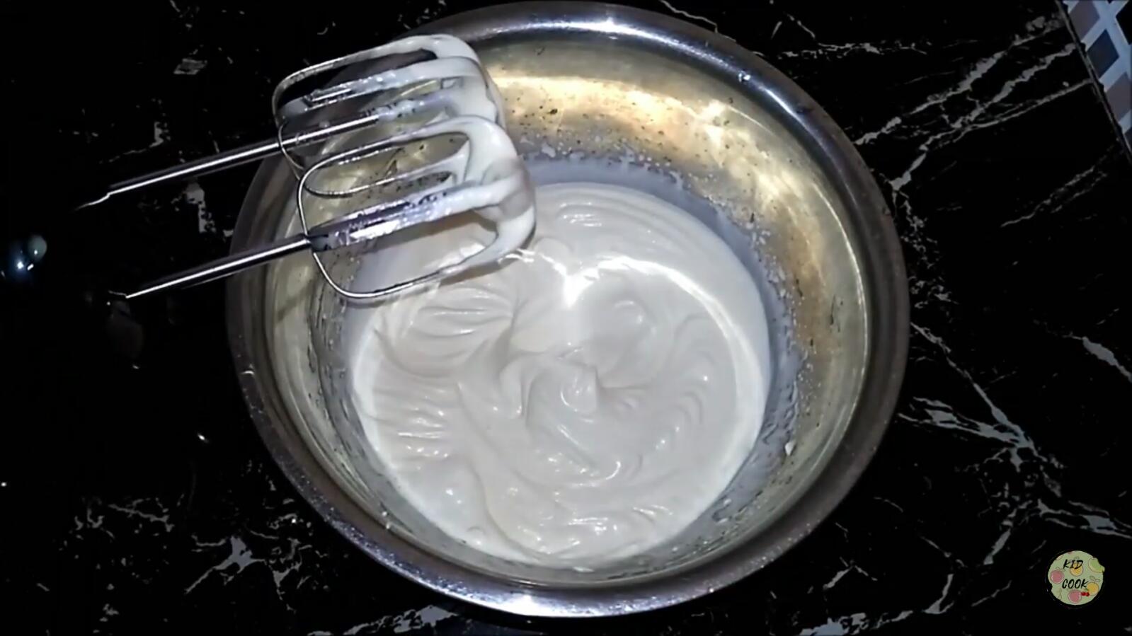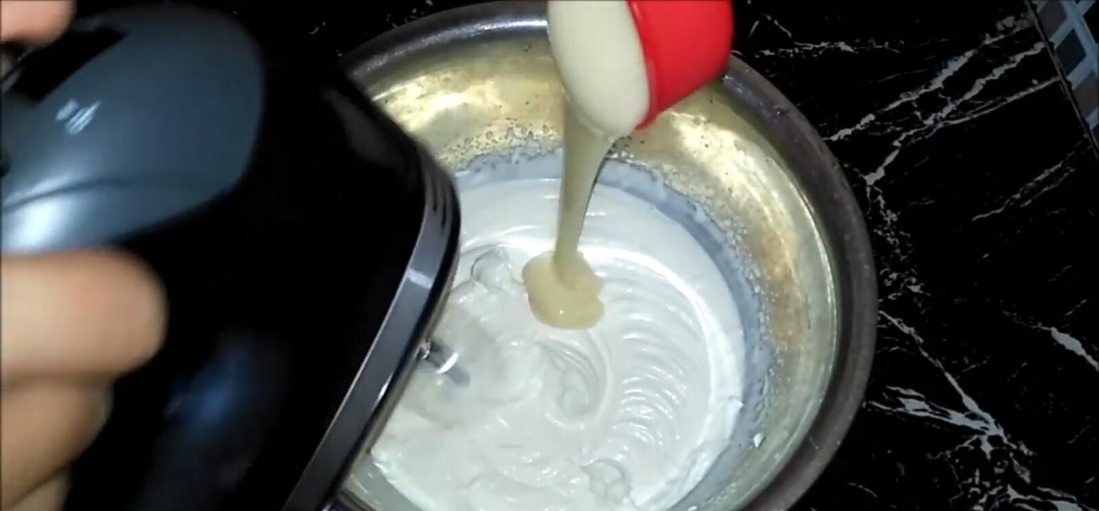 ตีจนครีมข้นขึ้นก็ใส่นมข้น 1/2 ถต. ตีต่อจนตั้งยอดอ่อนๆ