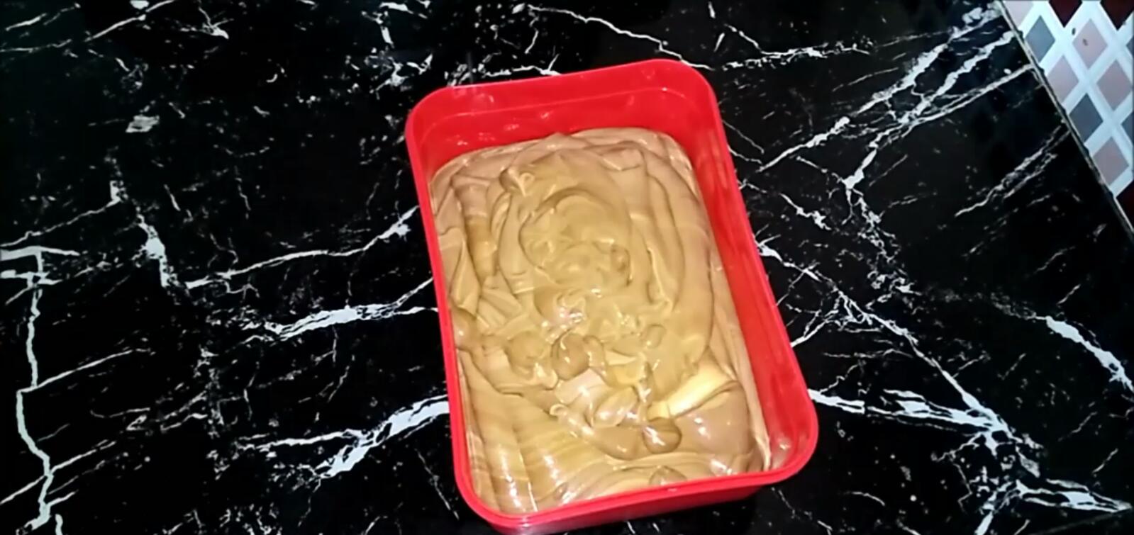 เทใส่กล่อง เคาะไร้ฟองอากาศเล็กน้อย ปิดฝาแช่ช่องฟรีช7-8 ชม.
