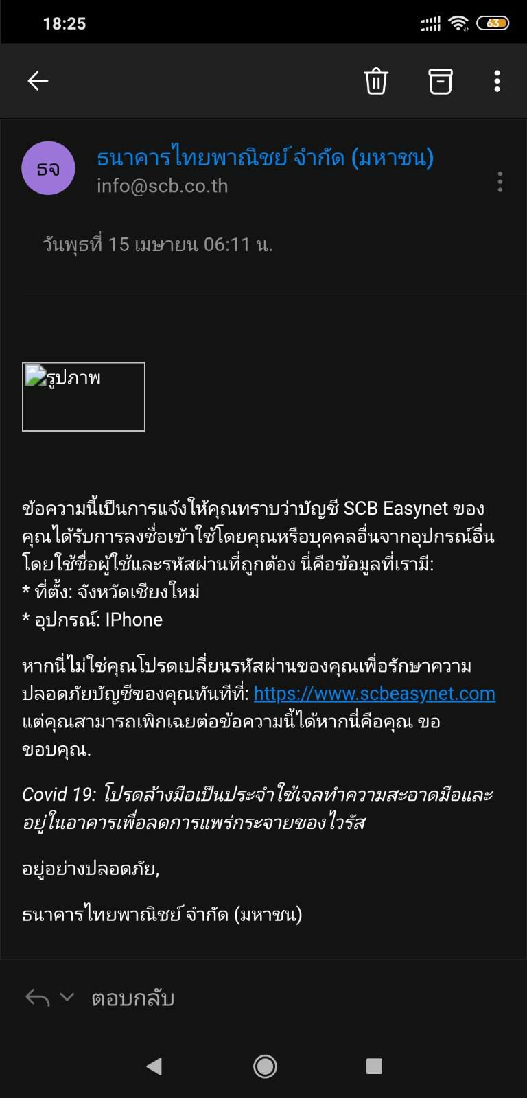 วันอังคารที่ผ่านมา ผมเห็นอีเมลฉบับหนึ่งใน Junk Folder ต้นทางระบุว่ามาจาก ธนาคารไทยพาณิชย์ จำกัด (มหาชน) หัวเรื่องที่ส่งมาหาคือ การแจ้งเตือนการละเมิดข้อมูล Email Address info@scb.co.th