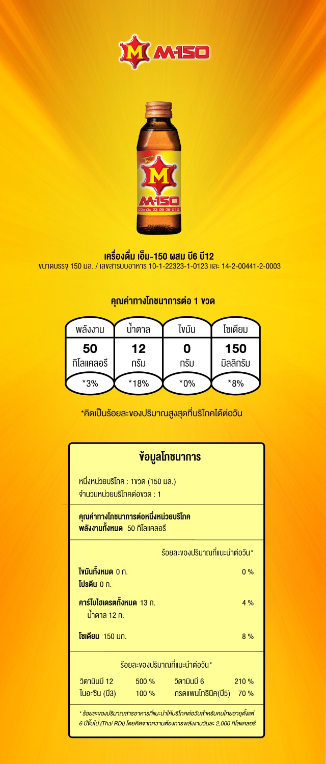 ผมปั่นสปินไบด์วันละ1ชม.มาเกือบปีแล้วครับ โดยตอนปั่นจะกินm150 1ขวด ที่เลือกm150เพราะพลังงานน้อยกว่ากระทิงแดงครึ่งนึง วันนี้บังเอิญสังเกตุสลากมันเขียนตามนี้เลยครับ