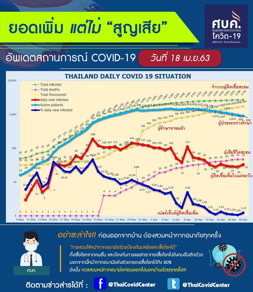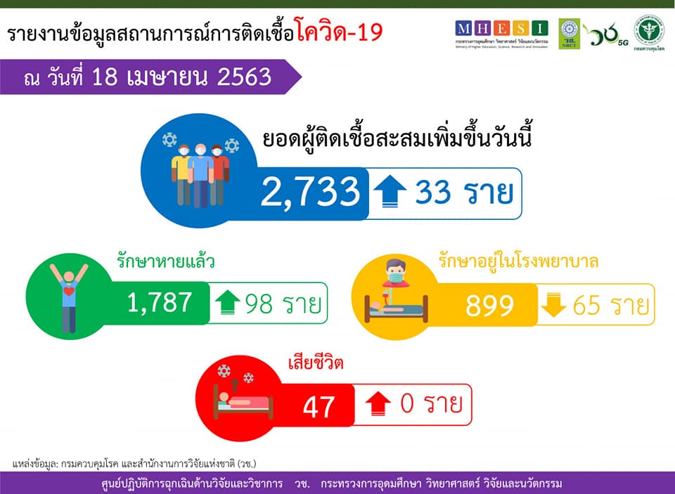 (ศบค.) แถลงสถานการณ์แพร่ระบาดไวรัสโควิด-19 ประจำวัน ว่า ประเทศไทยพบจำนวน ผู้ติดเชื้อรายใหม่เพิ่ม 33 ราย รวมผู้ป่วยสะสม 2,733 ราย ไม่มีผู้เสียชีวิตเพิ่ม สรุปยอดเสียชีวิตคงเดิม คือ 47 ราย