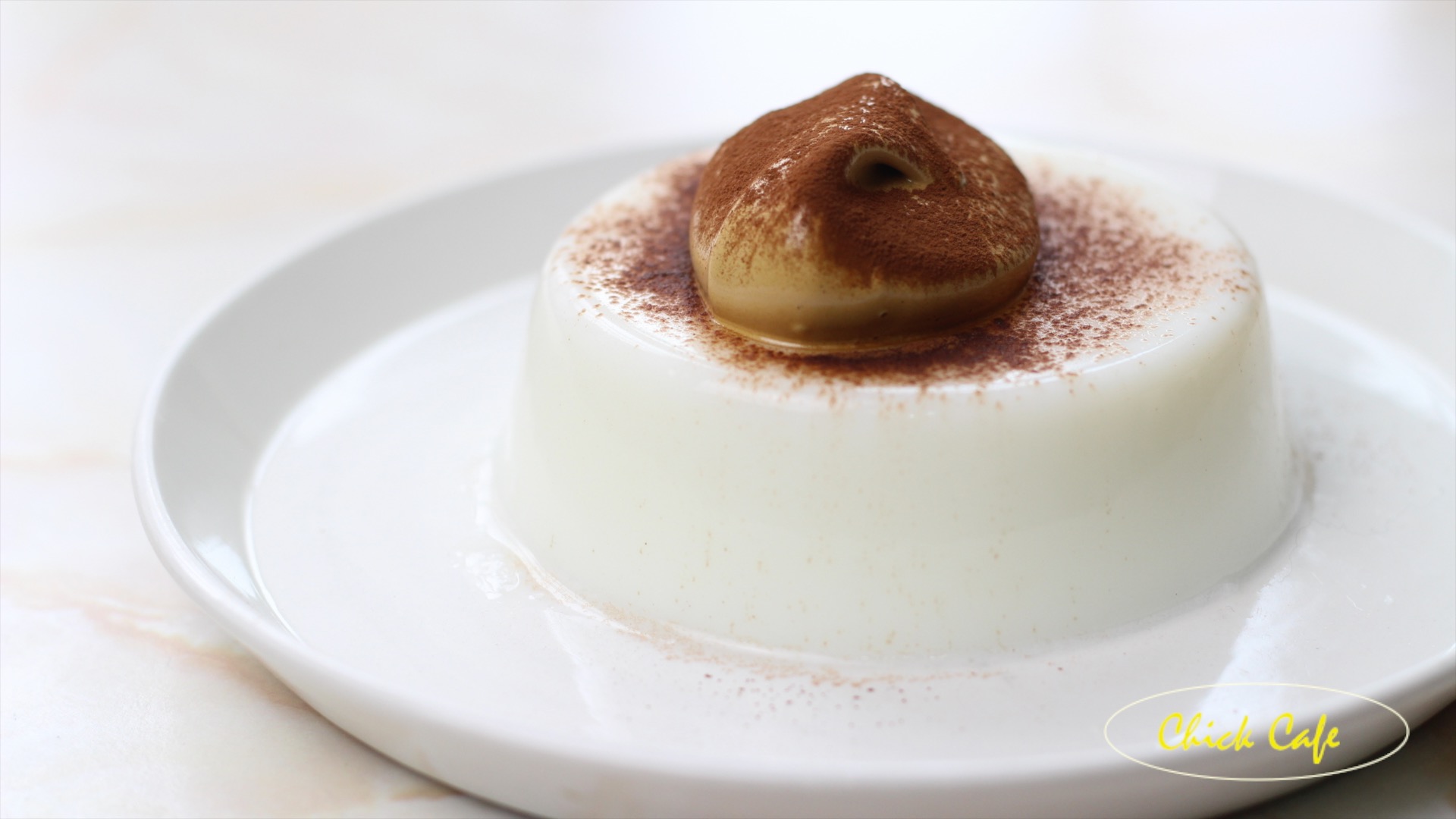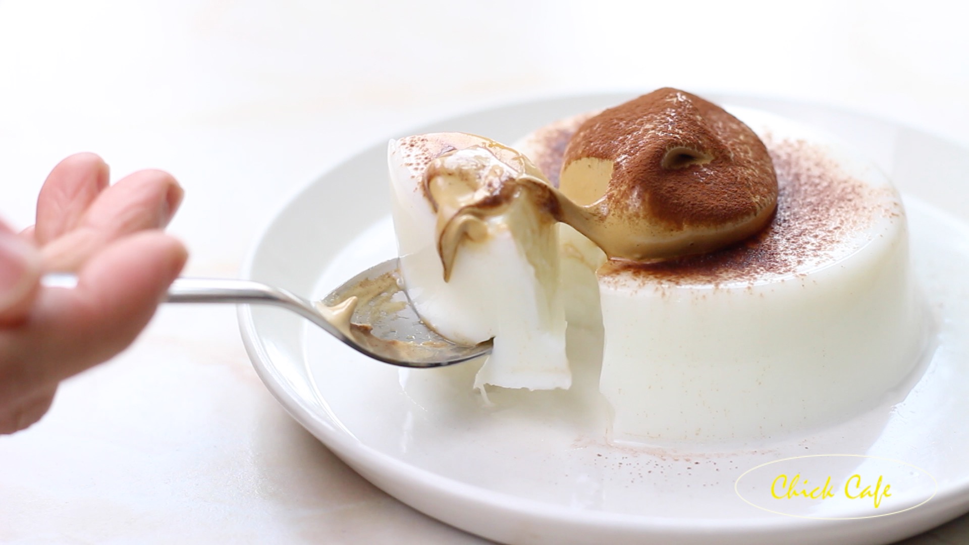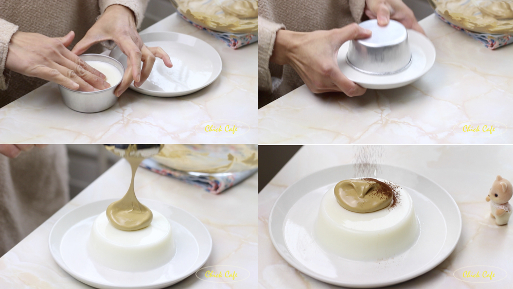 นำวุ้นนมสดมาถอดพิมพ์ เเละตกเเต่งด้วยฟองกาเเฟกับโรยด้วยผงโกโก้ ก่อนจัดเสิร์ฟได้ค่ะ