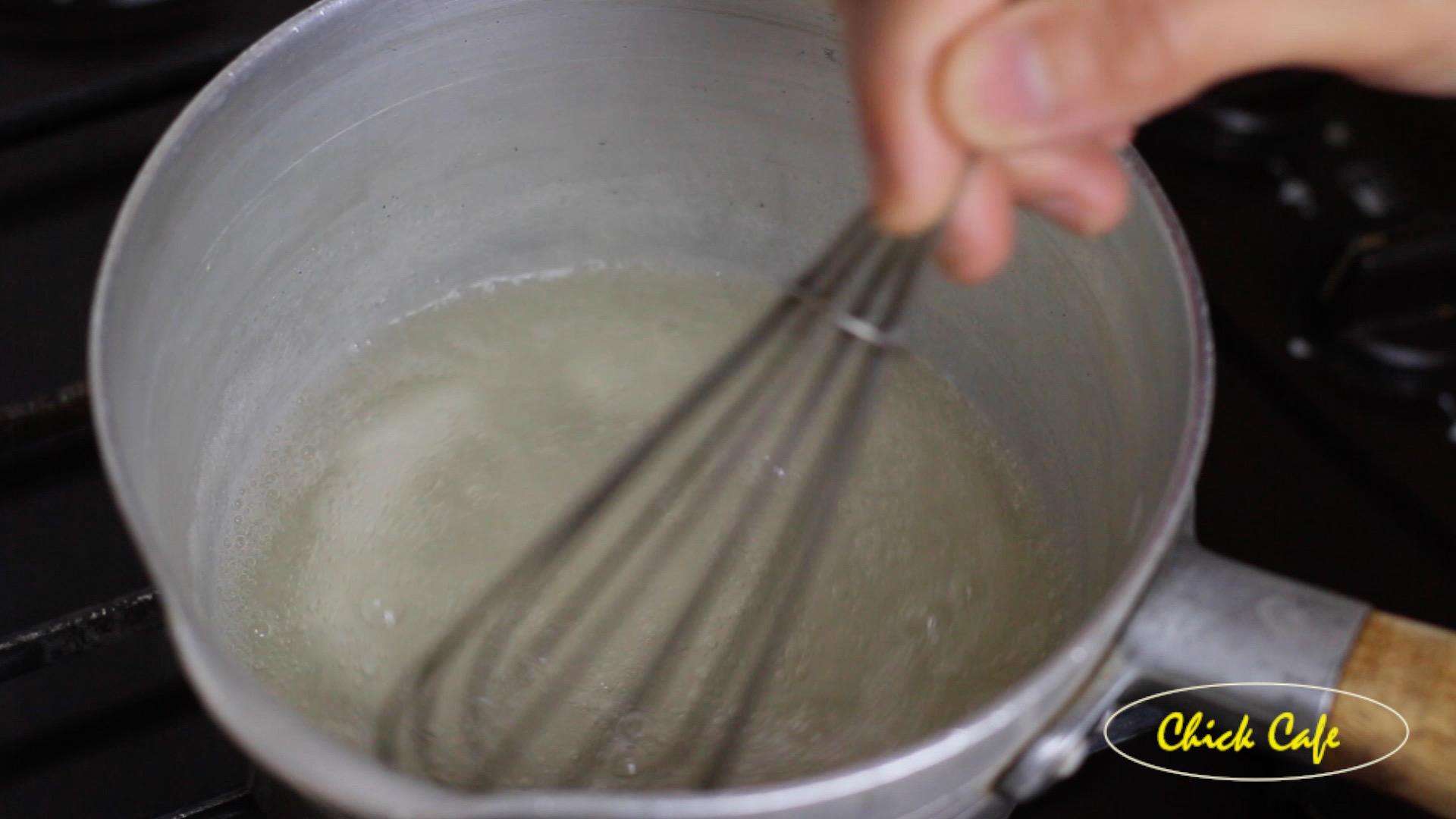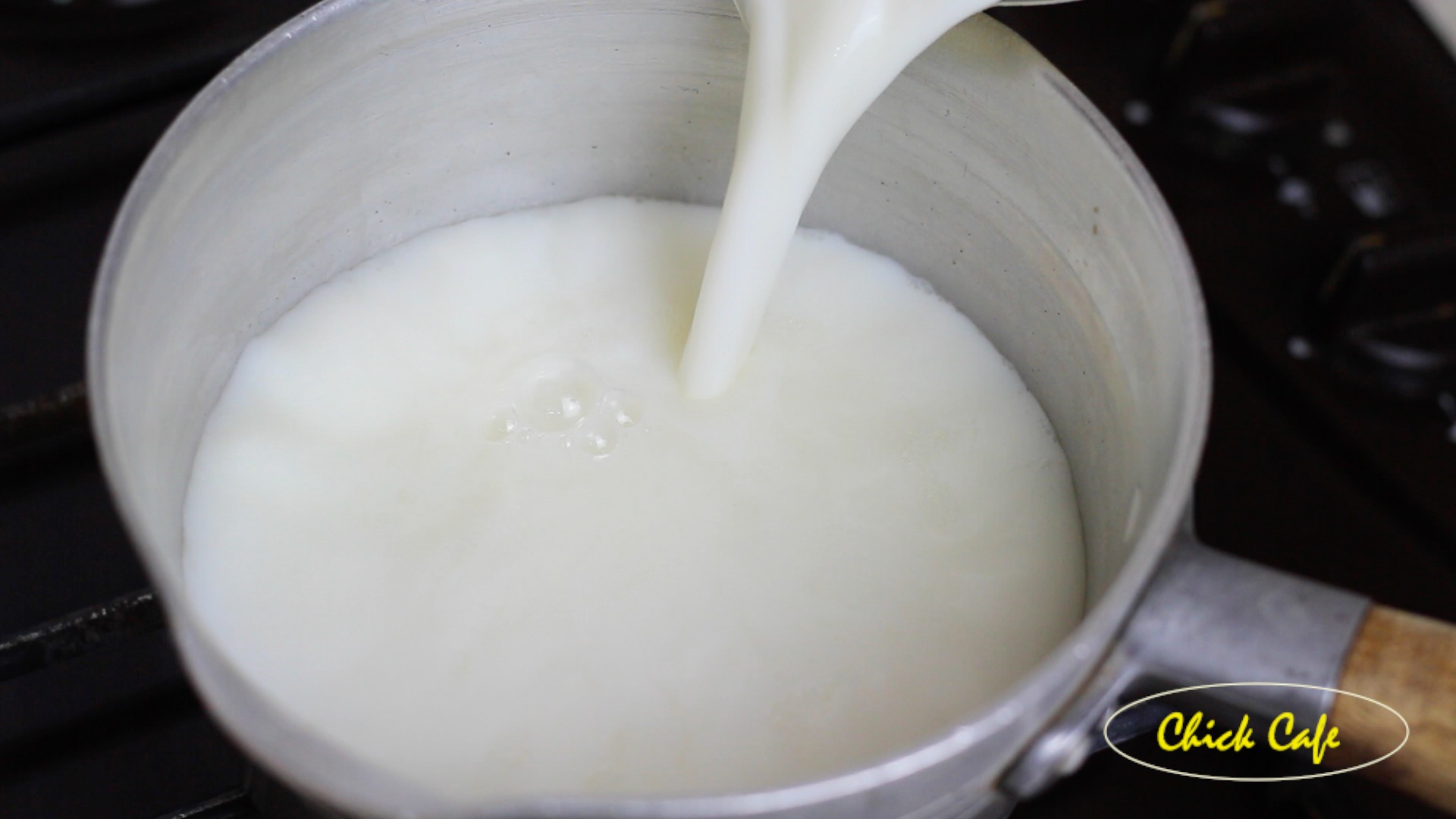 3 เทนมลงไปผสมให้เข้ากัน เเล้วเปิดไฟ ใช้ไฟกลางค่อนไปทางอ่อน