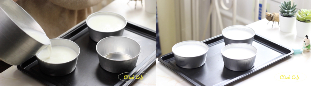 5 เทนมใส่ในพิมพ์ที่เตรียมไว้ เเล้วพักไว้ให้เย็นตัวประมาณ 15 นาทีก่อนจะนำไปเเช่ในตู้เย็นจนเซ็ตตัว อย่างน้อย 2 ชั่วโมง
