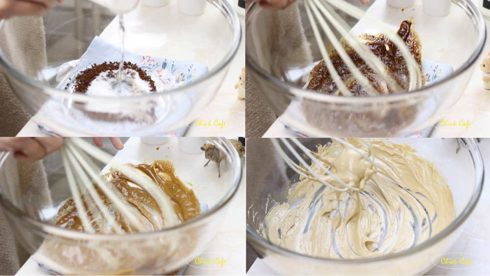 ใส่ผงกาเเ นํ้าตาล เเละนํ้าร้อนในอ่างผสม เเล้วตีให้ขี้นยอด เเล้วนำไปจัดเสิร์ฟได้