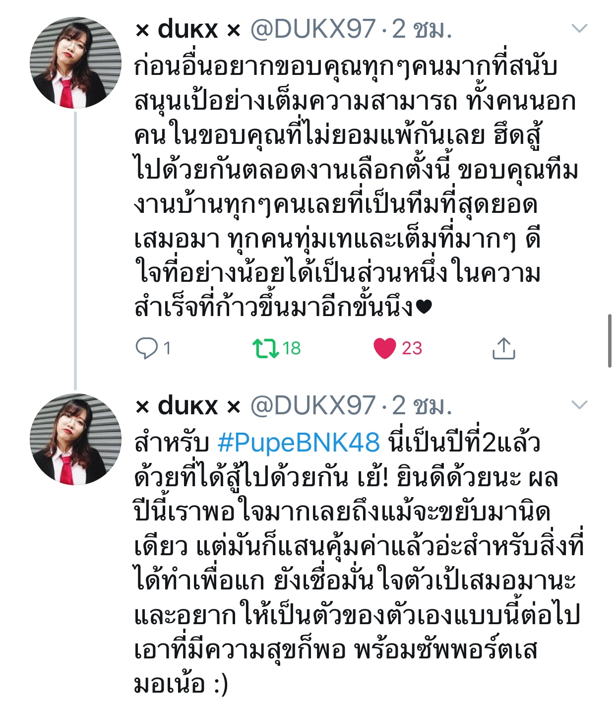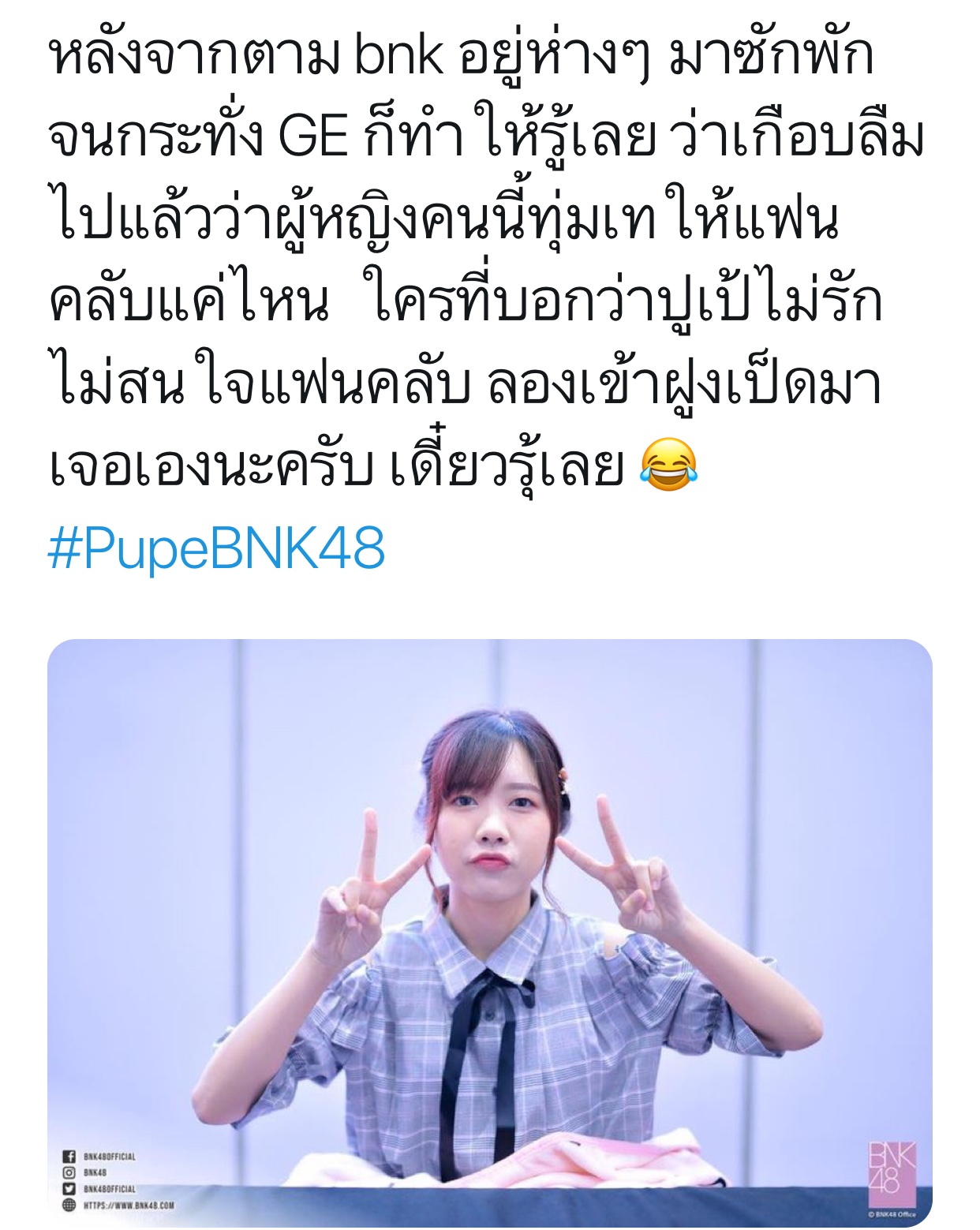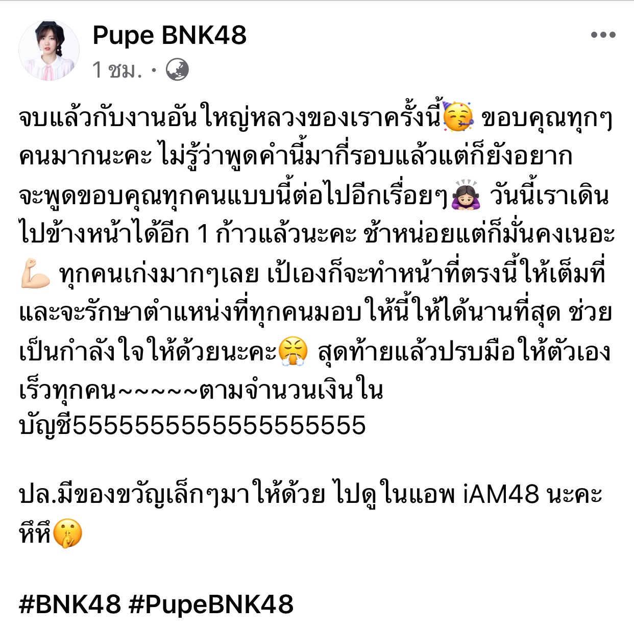 ต่อจากนี้ก็อยากจะให้ทุกคนเป็นกำลังใจให้ แล้วก็สนับสนุนทั้งเป้แล้วก็เมมเบอร์ทุกๆคนทั้งBNK48 และCGM48 นะคะ