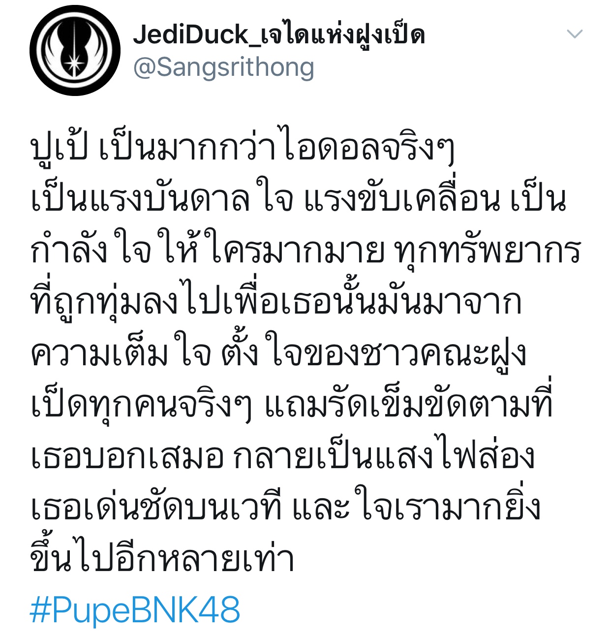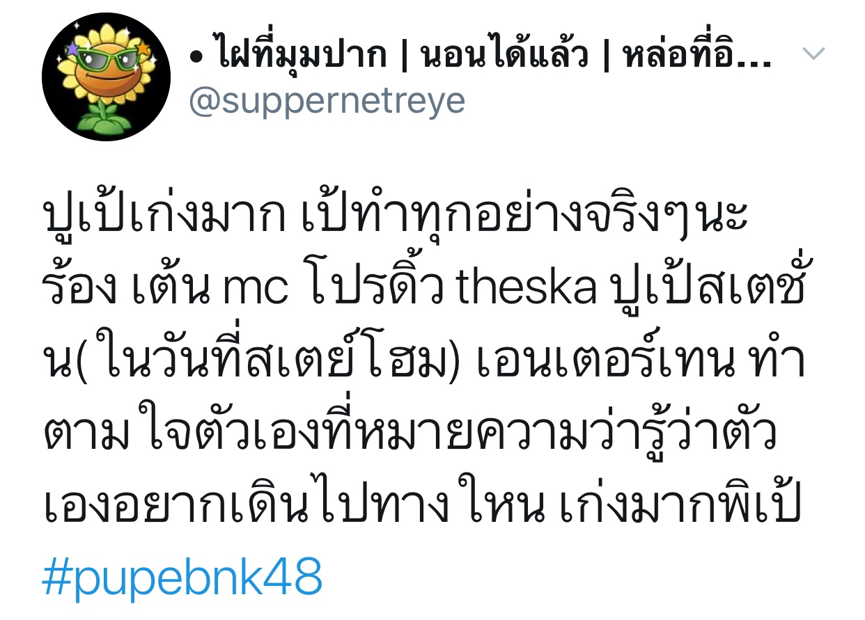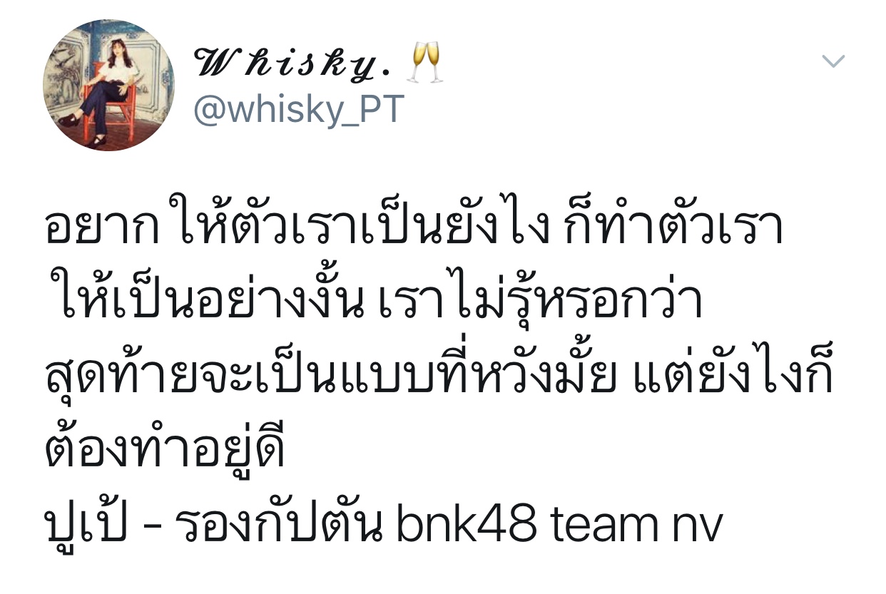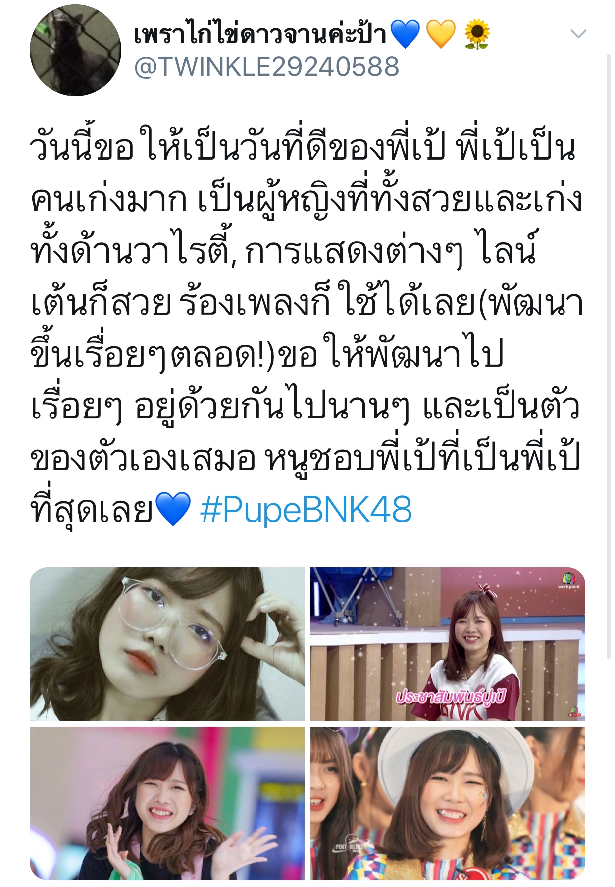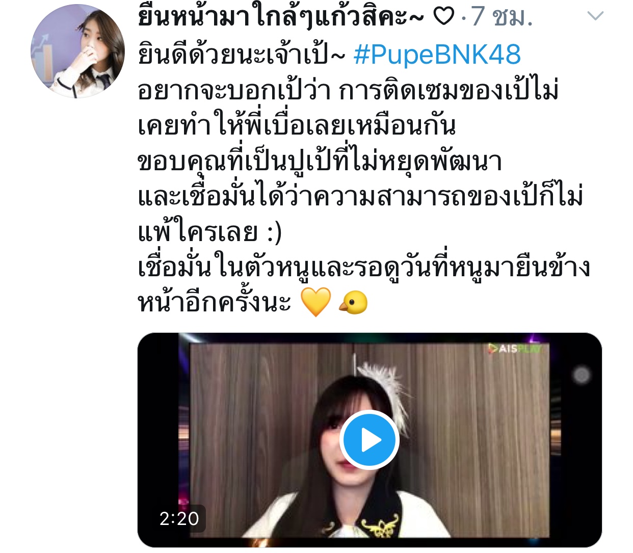 เป้ออดิชั่นเข้าBNK48 เพื่อที่จะได้ร้องเพลง ได้เต้นได้ทำการแสดงบนเวที ก็เหมือนกับที่พูดไปปีที่แล้วคือตำแหน่งเซมบัทสึนี้ มันทำให้เป้อยู่บนเวทีได้นานขึ้นซึ่งปูเป้ก็ขอบคุณมากๆที่ทุกคนมอบตำแหน่งนี้ให้นะคะ