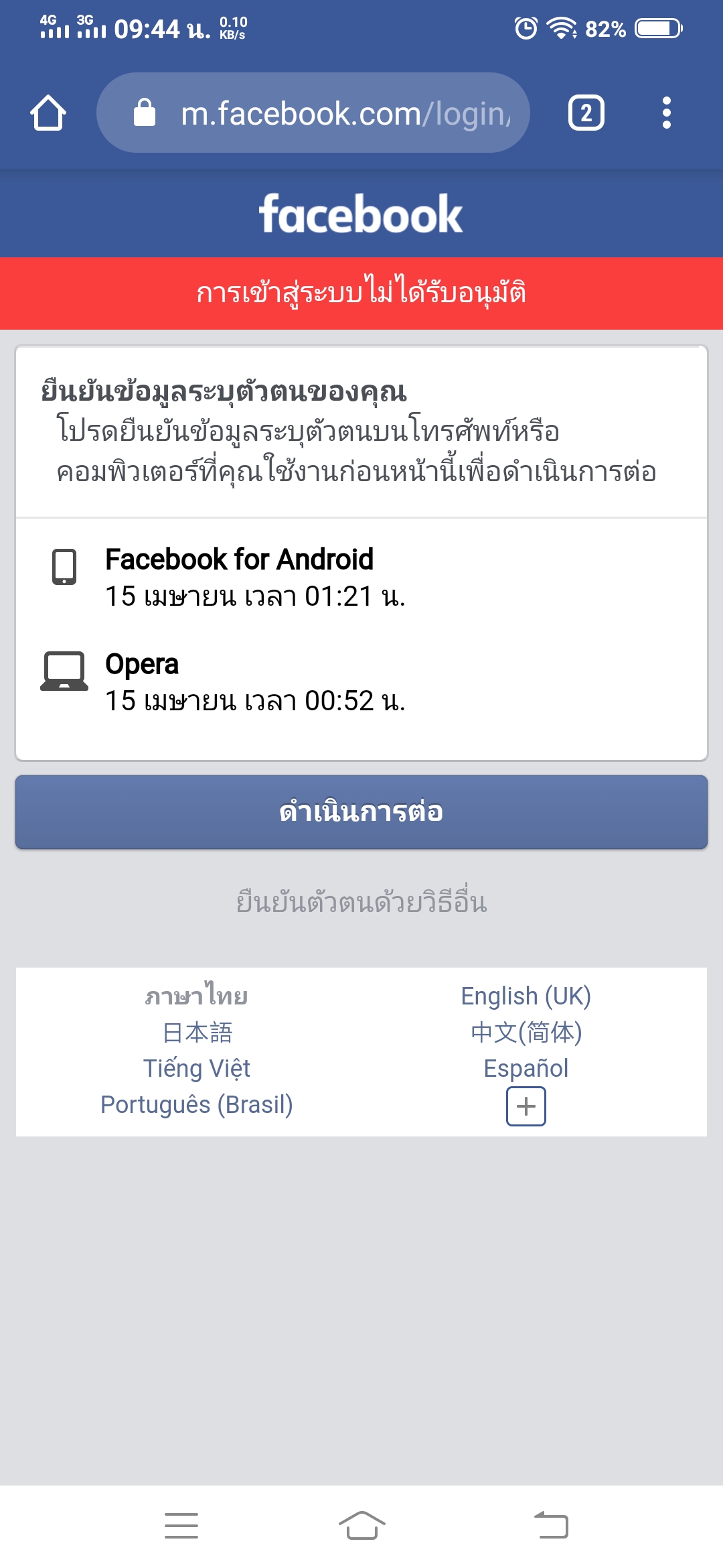เราตรวจพบกิจกรรมที่น่าสงสัยบนบัญชีผู้ใช้ Facebook ของคุณ จึงได้ล็อกบัญชีไว้ชั่วคราวเพื่อความปลอดภัย มีแนวโน้มว่า บัญชีผู้ใช้ของคุณถูกบุกรุกเนื่องจากคุณป้อนรหัสผ่านบนเว็บไซต์ที่ดูเหมือนกับ Facebook การ
