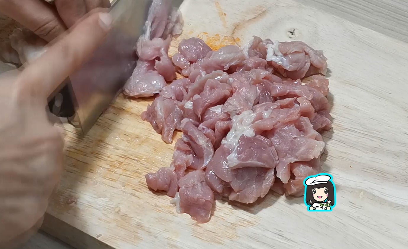 1.ฝานเนื้อเป็นชิ้นเล็กๆสับแค่พอหยาบไม่ต้องให้ละเอียดมาก