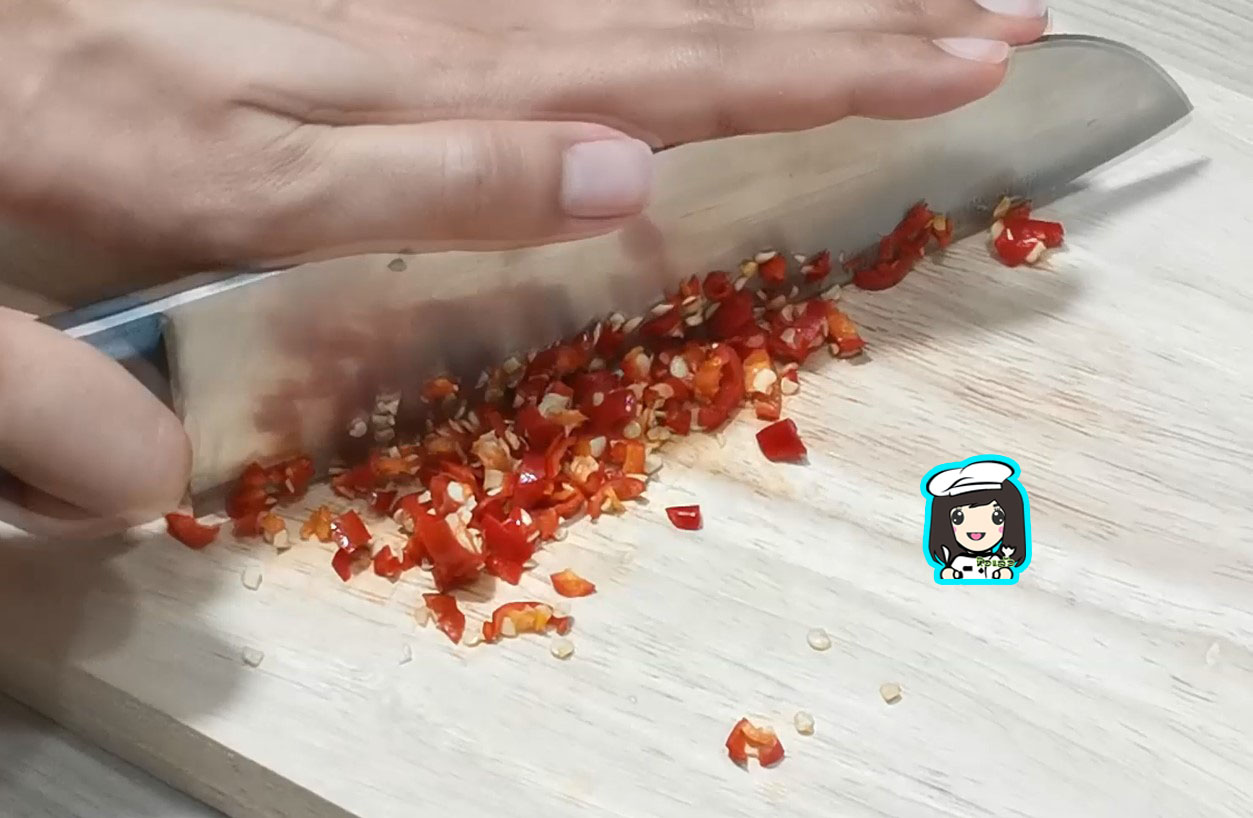 2.กระเทียม พริกสด ใช้วิธีการสับ ไม่โขลก พริกแห้งแช่น้ำจนนิ่มซับให้แห้งซอยหยาบๆ