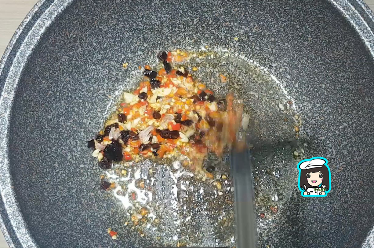 3.ตั้งกระทะใส่น้ำมันพืชลงไป ตามด้วยกระเทียม พริกสด พริกแห้ง ผัดจนมีกลิ่นหอมฉุน
