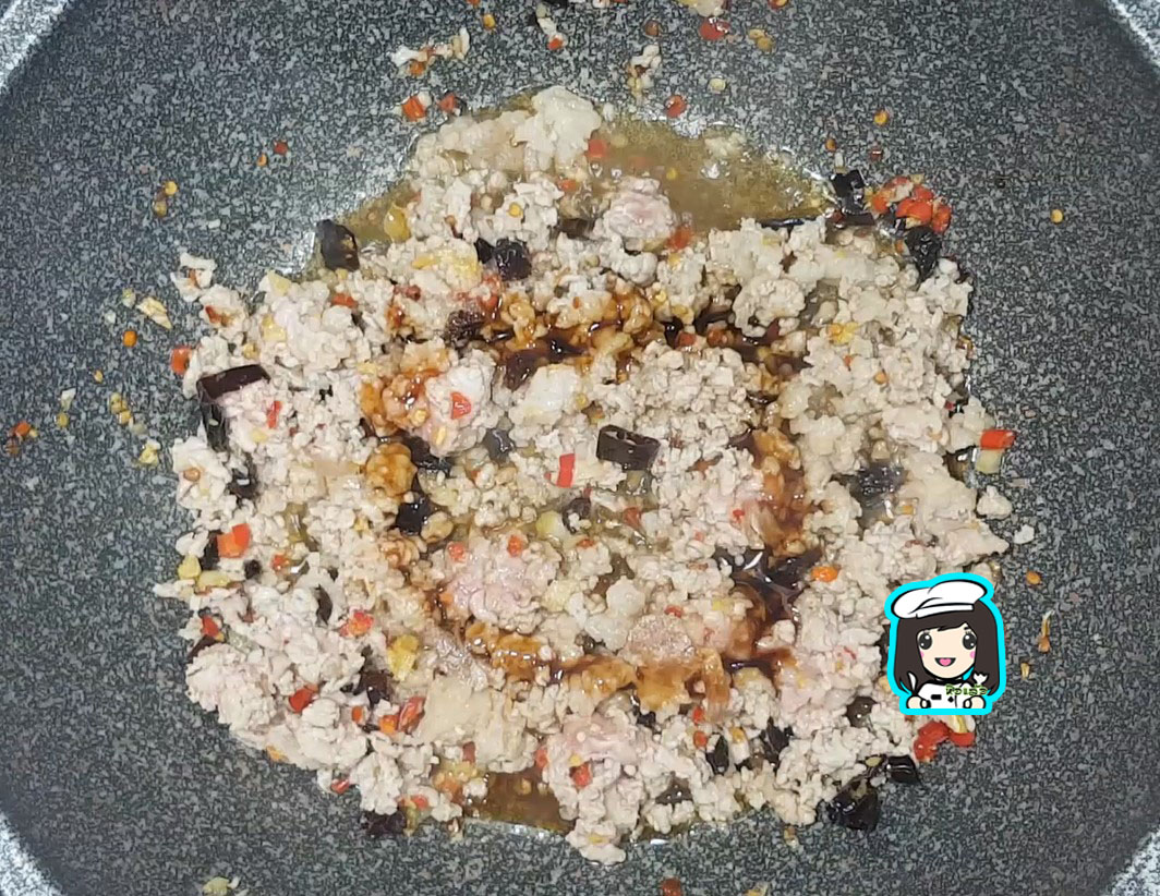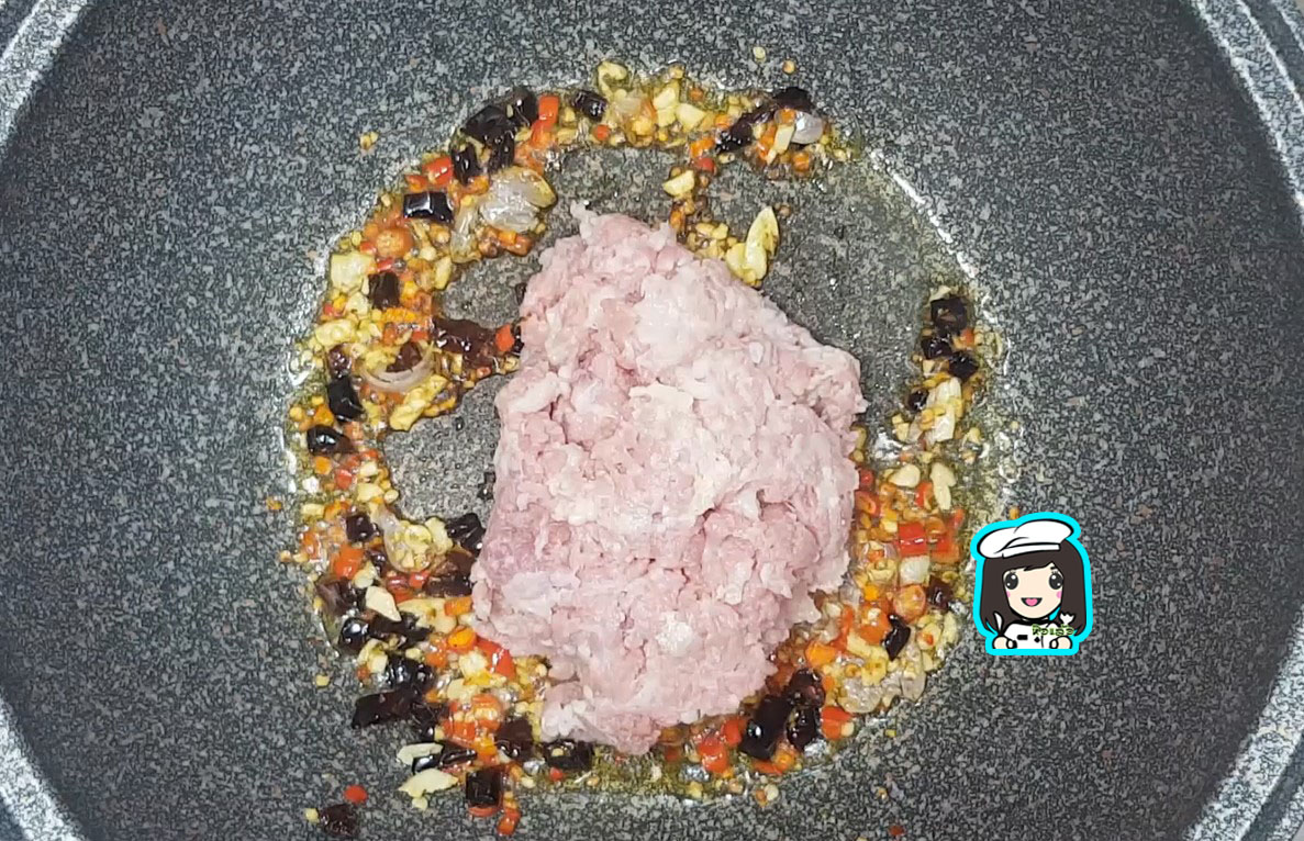 4.ใส่เนื้อสับคงไปคลุกเคล้าพริกกระเทียม เนื้อเริ่มสะดุ้งไฟ ปรุงรสด้วยน้ำตาลทราย ซอสปรุงรส น้ำมันหอย ผัดไวๆ